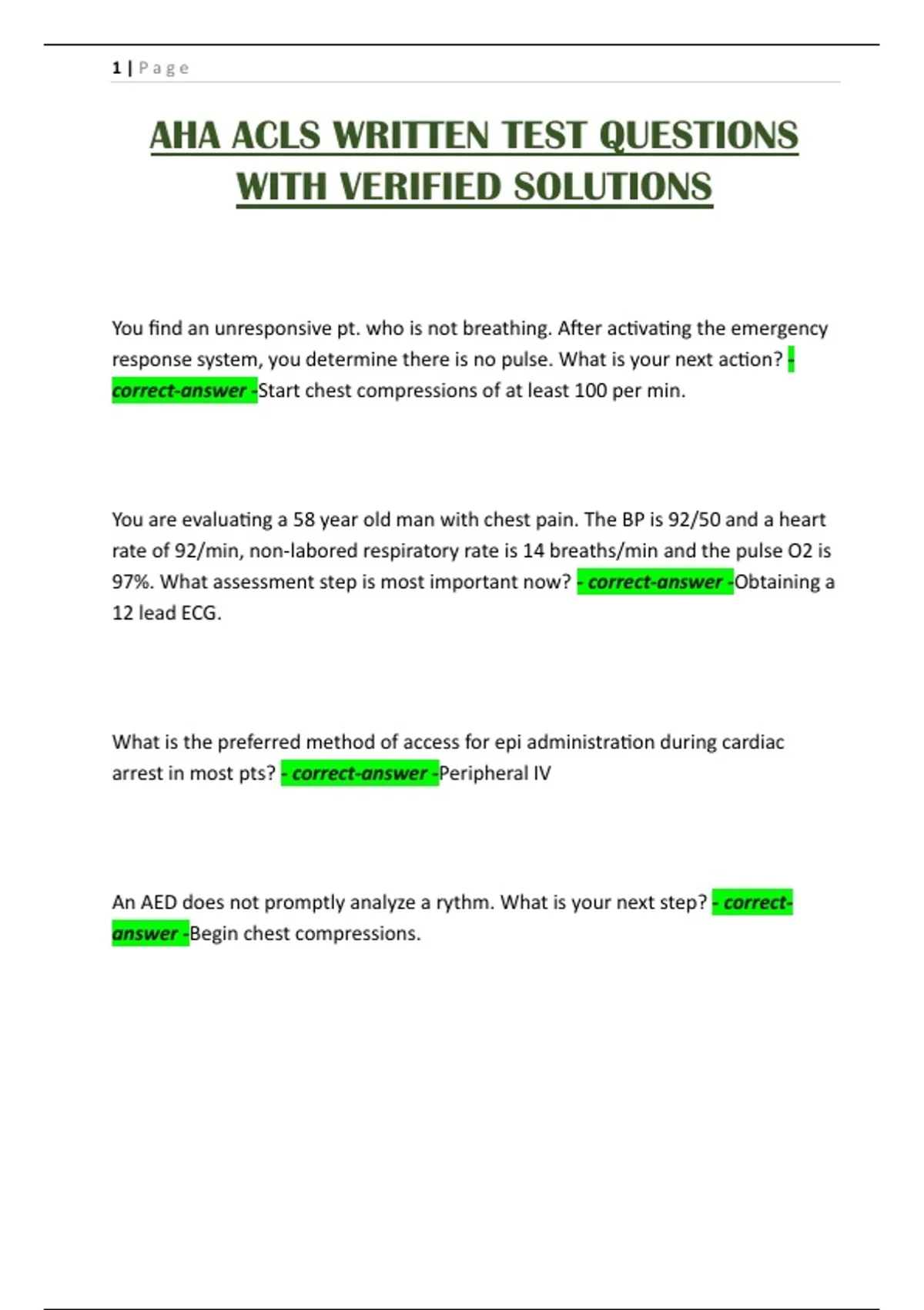 AHA ACLS WRITTEN TEST QUESTIONS WITH VERIFIED SOLUTIONS