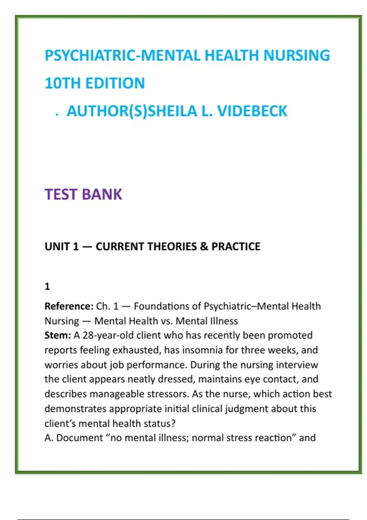 Psychiatric–Mental Health Nursing Test Bank | Videbeck 10th Ed | NCLEX-Style Psych Nursing MCQs & Therapeutic Communication 2) SEO Product Description (200–300 words) Master psychiatric–mental health nursing with confidence using this comprehensive Psychiatric–Mental Health Nursing Test Bank aligned to Sheila L. Videbeck’s globally trusted 10th Edition textbook. Designed for nursing students and educators, this exam-focused digital resource delivers full textbook coverage with 20 high-quality NCLEX-style MCQs per chapter, each paired with clear, evidence-based rationales that strengthen clinical judgment and therapeutic communication skills. Every question reflects realistic psychiatric nursing scenarios requiring application, analysis, and prioritization—mirroring the complexity of NCLEX-RN® mental health content and real clinical practice. Items emphasize patient safety, ethical and legal responsibilities, nurse–patient relationship boundaries, trauma-informed care, and psychopharmacology, ensuring learners develop sound psychiatric nursing judgment rather than rote memorization. This test bank is ideal for students enrolled in Psychiatric–Mental Health Nursing (PMHN), Behavioral Health Nursing, and Psychosocial Nursing courses, as well as for NCLEX-RN® psychiatric nursing preparation and clinical rotation readiness. Faculty and clinical instructors will also find it valuable for exam creation, remediation, and skills validation. What’s included: Full coverage of ALL units and chapters from Videbeck’s Psychiatric–Mental Health Nursing, 10th Edition 20 NCLEX-style psych nursing MCQs per chapter Correct answers with detailed rationales for every option Clinical judgment scenarios grounded in therapeutic communication Focus on mental health assessment, crisis intervention, safety, and ethics This test bank is a time-saving, confidence-building study solution that reinforces core psychiatric nursing concepts while preparing learners for exam success and safe, patient-centered mental health care. 3) 8 High-Value SEO Keywords psychiatric mental health nursing test bank Videbeck psychiatric nursing mental health nursing study guide psych nursing MCQs NCLEX psychiatric nursing questions therapeutic communication nursing questions psychiatric nursing exam prep behavioral health nursing test bank 4) 10 Hashtags #PsychiatricMentalHealthNursing #PsychNursingTestBank #VidebeckNursing #NCLEXPsychPrep #MentalHealthNursing #TherapeuticCommunication #BehavioralHealthNursing #NursingExamPrep #PsychNursingStudents #NCLEXRNPreparation
