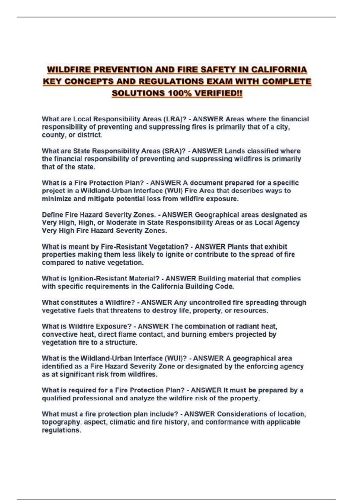 WILDFIRE PREVENTION AND FIRE SAFETY IN CALIFORNIA KEY CONCEPTS AND REGULATIONS EXAM WITH COMPLETE SOLUTIONS 100% VERIFIED!!...