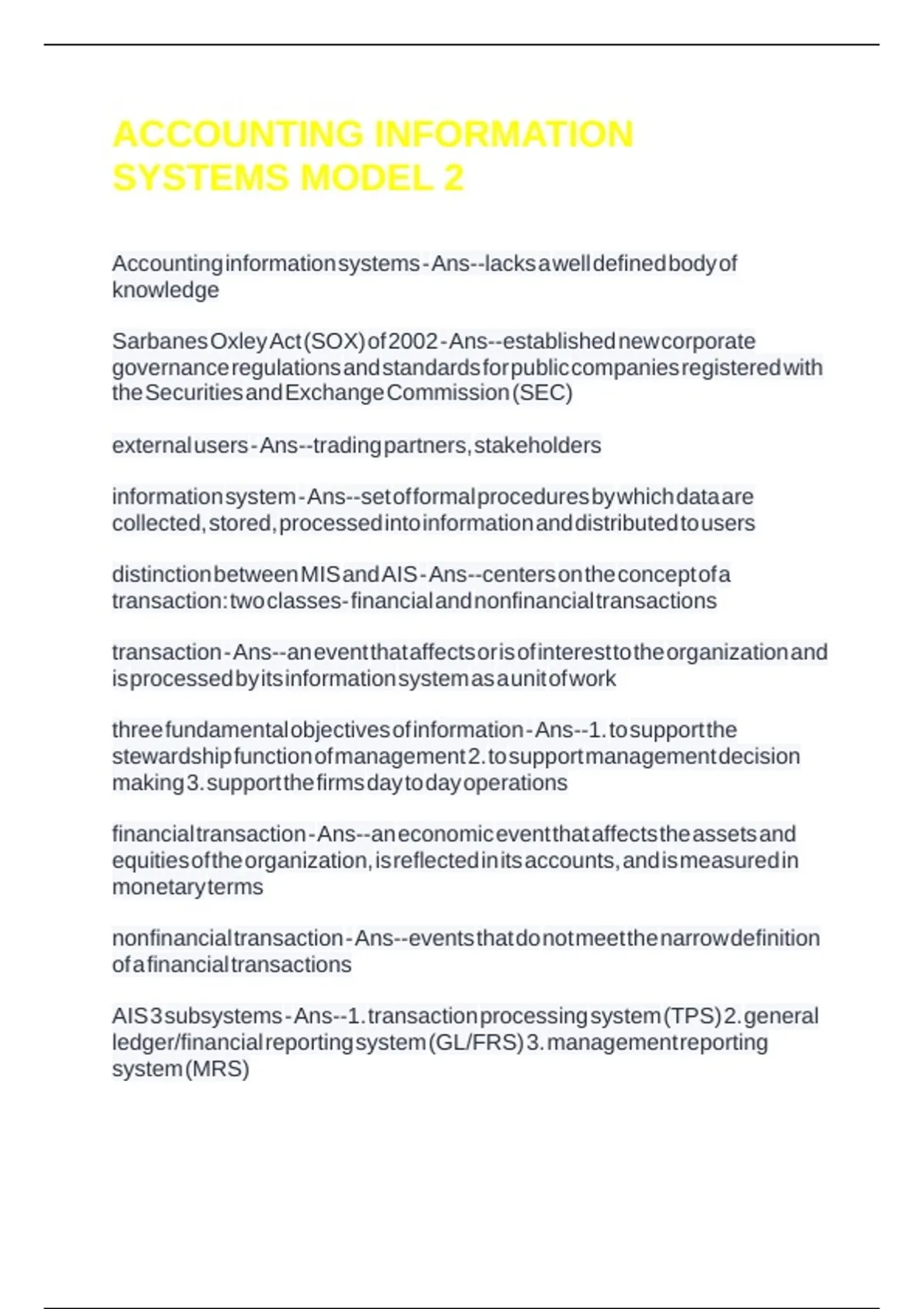AIS 3 subsystems - Ans--1. transaction processing system (TPS) 2. general