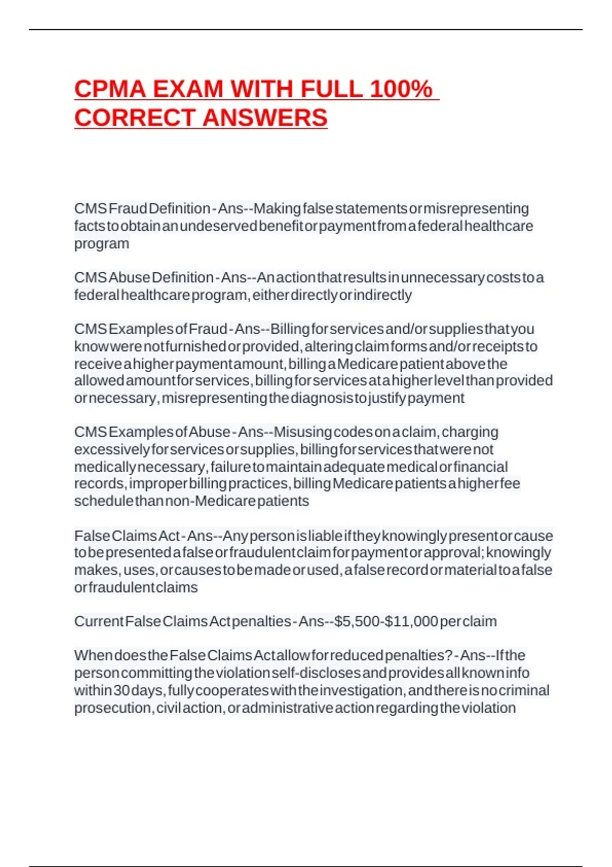 CMS Fraud Definition - Ans--Making false statements or misrepresenting