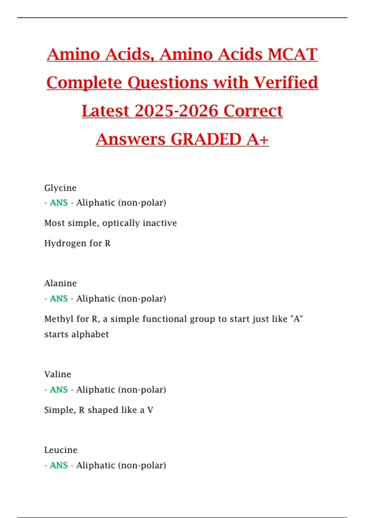The Amino Acids – MCAT Complete Questions (2025/2026) resource provides a comprehensive set of verified practice questions with correct answers covering all key concepts related to amino acids and proteins. Topics include amino acid structure, classification, side chain properties, peptide bond formation, and their roles in protein function and enzyme activity. Achieving a Grade A+, this resource serves as a reliable study guide, practice question bank, and self-assessment tool to reinforce understanding, strengthen recall, and boost confidence for the MCAT Biochemistry section