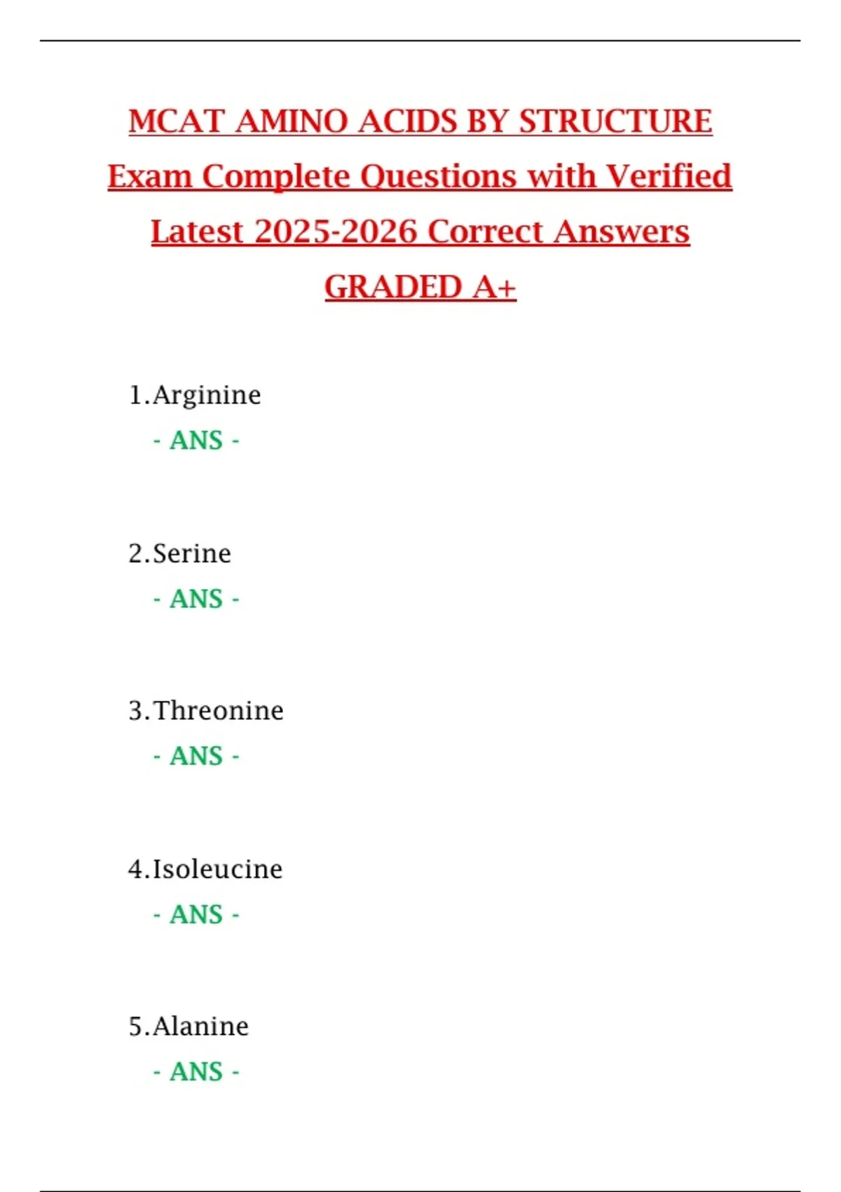 The MCAT Amino Acids by Structure – Complete Questions (2025/2026) resource provides a comprehensive set of verified practice questions with correct answers focused on amino acids classified by their chemical structures. This includes nonpolar, polar, acidic, basic, and aromatic amino acids, as well as their roles in protein structure and enzyme function. Achieving a Grade A+, this resource serves as a reliable study guide, practice question bank, and exam preparation tool to strengthen understanding, reinforce memorization, and boost confidence for the MCAT Biochemistry section.