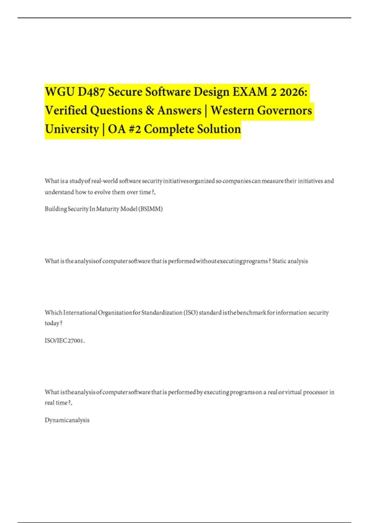 WGU D487 Secure Software Design EXAM 2 2026: Verified Questions & Answers | Western Governors University | OA #2 Complete Solution