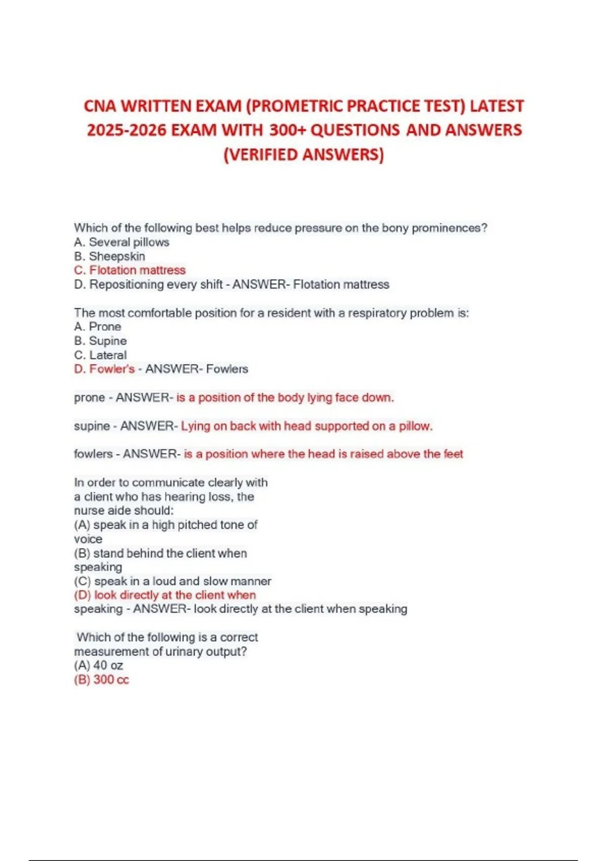 To turn those 300+ questions into sales, your description needs to promise two things: speed (saving time) and certainty (passing the first time). Here is a high-converting description template you can copy and paste. CNA Written Exam (Prometric) | 300+ Verified Practice Questions & Answers Stop stressing about the CNA Written Exam. This comprehensive study guide is designed specifically for the Prometric testing format. Whether you are struggling with medical terminology or the legal aspects of care, this 300+ question bank ensures you won’t be surprised on exam day. What’s Included? 300+ Latest Practice Questions: Updated for the 2026 exam cycle. Verified Answers: Every answer is checked for accuracy against current CNA standards. Rationales & Explanations: Understand the why behind the answer so you can tackle similar questions with ease. Full Coverage: Questions cover all major Prometric domains, including: Role of the Nurse Aide Promotion of Safety & Infection Control Basic Nursing Care & Restorative Skills Mental Health & Social Service Needs Resident Rights Why Choose This Guide? Save Time: Don’t sift through massive textbooks. Study the exact material that appears on the test. Boost Confidence: Practice with the same wording and format used by Prometric. Proven Success: These questions are curated from the most recent exam feedback to ensure high pass rates. Note: This is a digital download. Get instant access and start studying on your phone, tablet, or laptop immediately!