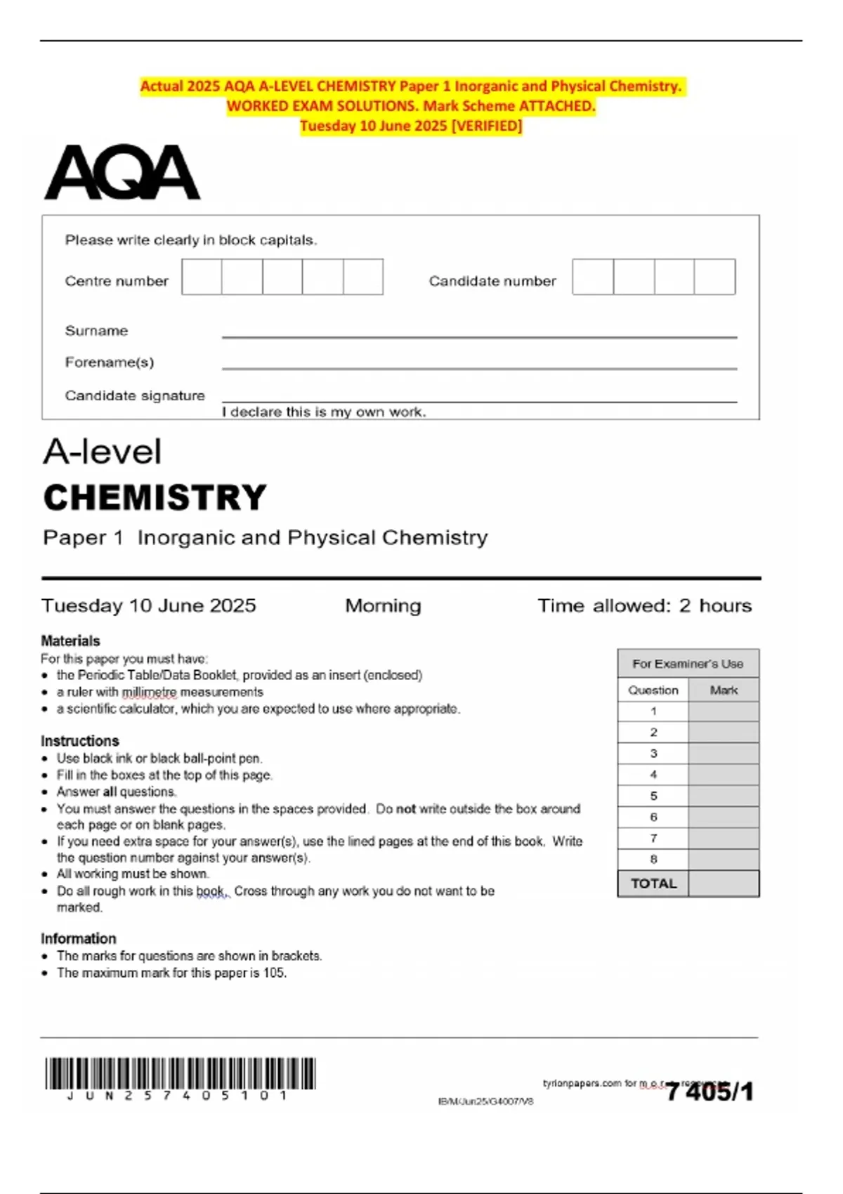 WORKED EXAM SOLUTIONS. Mark Scheme ATTACHED.