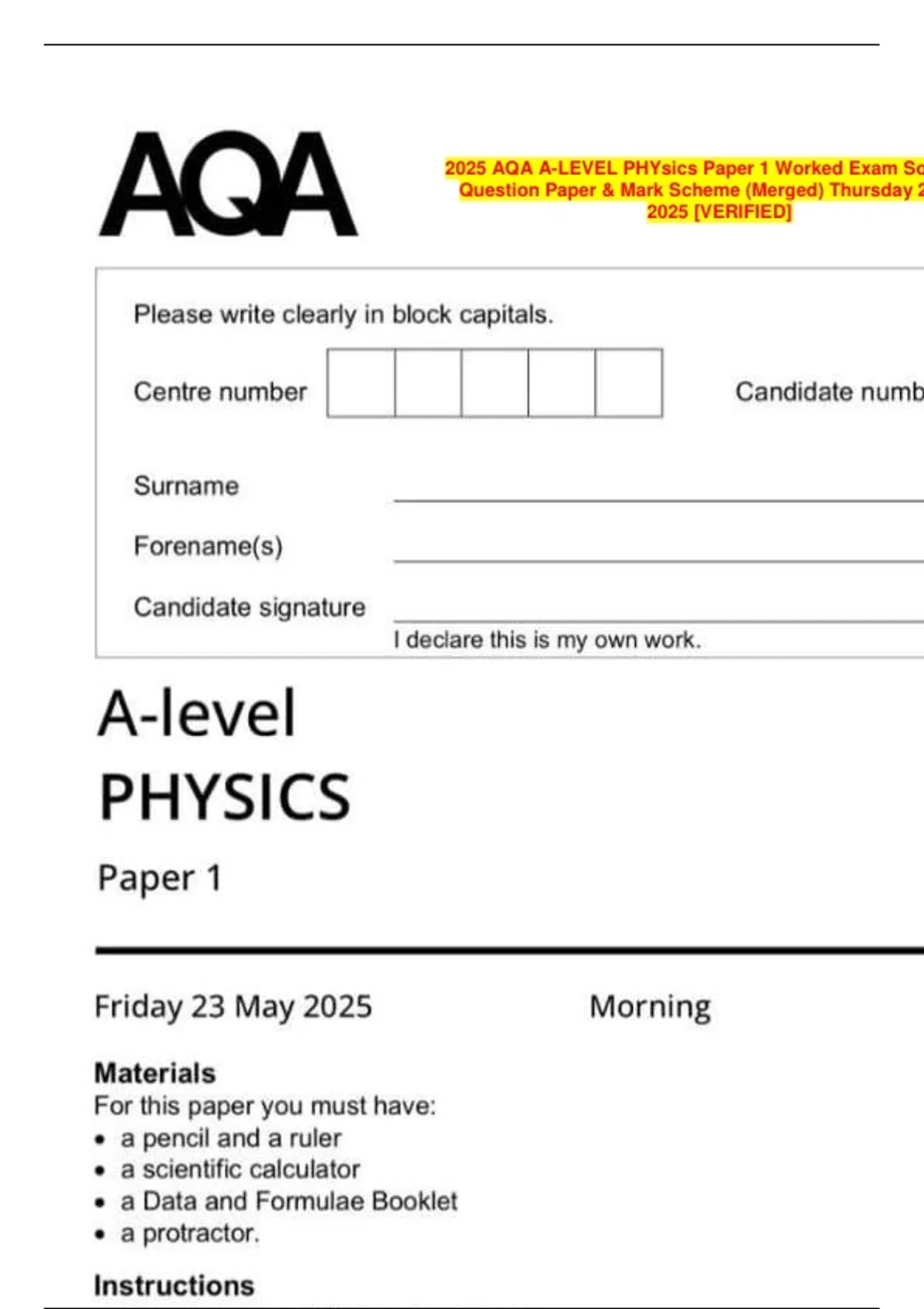 2025 AQA A-LEVEL PHYsics Paper 1 Worked Exam Solutions. Question Paper & Mark Scheme (Merged) Thursday 22 May 2025 [VERIFIED]