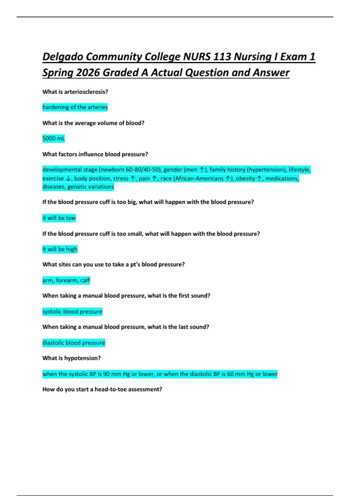 Delgado Community College NURS 113 Nursing I Exam 1