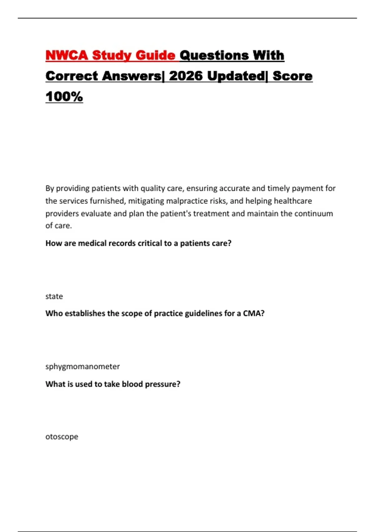 This document contains a comprehensive set of NWCA study guide questions with correct answers covering core medical assisting concepts, including clinical procedures, anatomy and physiology, phlebotomy, vital signs, EKG interpretation, infection control, and medical law and ethics. It is designed as a complete review resource for NWCA exam preparation and includes clear, direct answers to commonly tested questions to support effective studying and exam readiness.