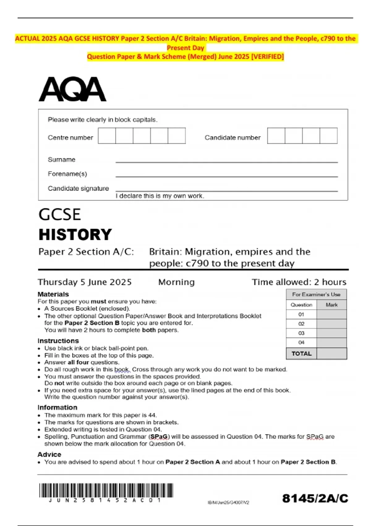 ACTUAL 2025 AQA GCSE HISTORY Paper 2 Section A/C Britain: Migration, Empires and the People, c790 to the Present Day Question Paper & Mark Scheme (Merged) June 2025 [VERIFIED]