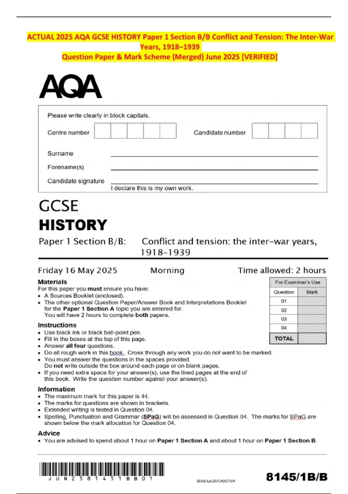 ACTUAL 2025 AQA GCSE HISTORY Paper 1 Section B/B Conflict and Tension: The Inter-War Years, 1918–1939 Question Paper & Mark Scheme (Merged) June 2025 [VERIFIED]
