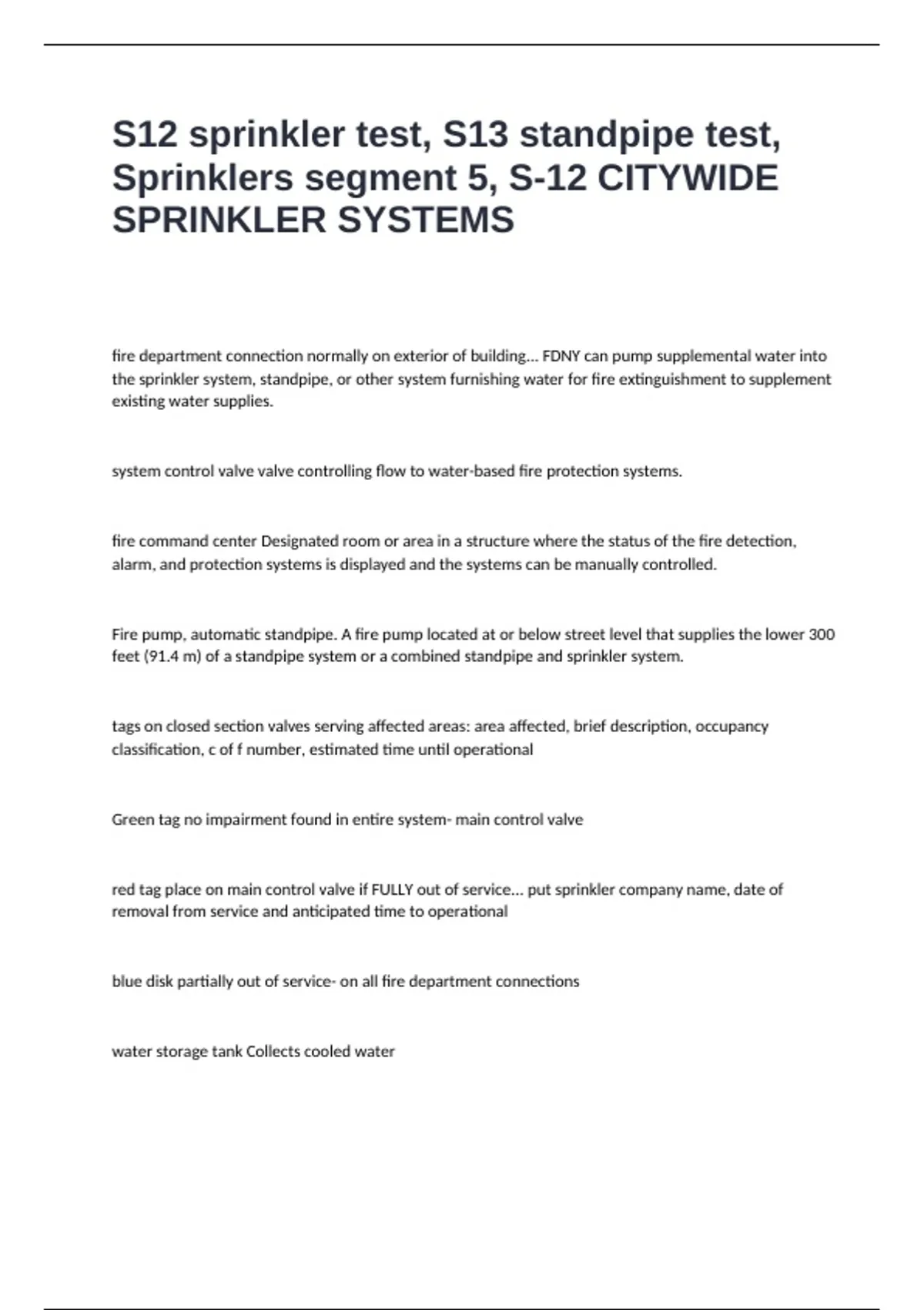 S12 sprinkler test, S13 standpipe test, Sprinklers segment 5, S-12 CITYWIDE SPRINKLER SYSTEMS