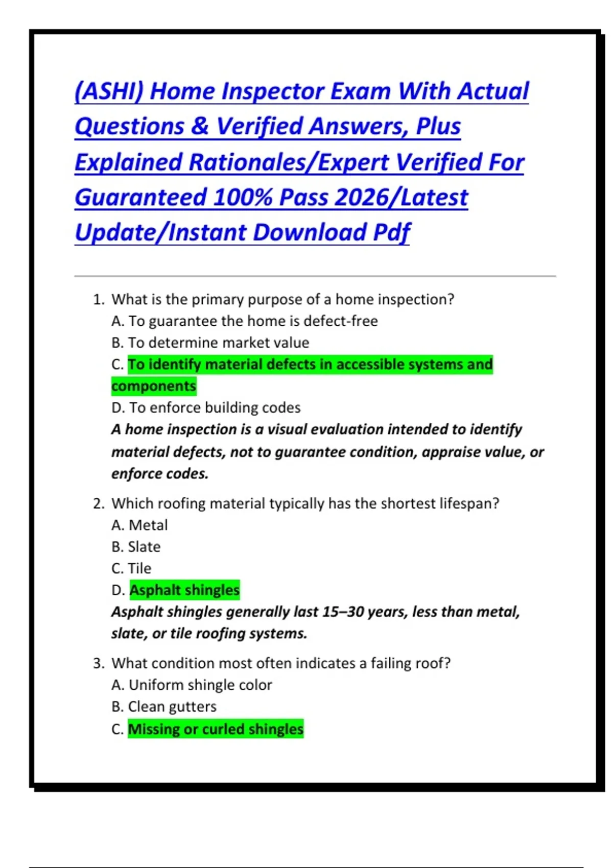 1. What is the primary purpose of a home inspection?