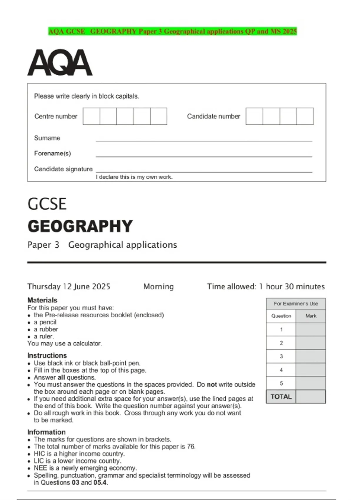 AQA GCSE GEOGRAPHY Paper 3 Geographical applications QP and MS 2025