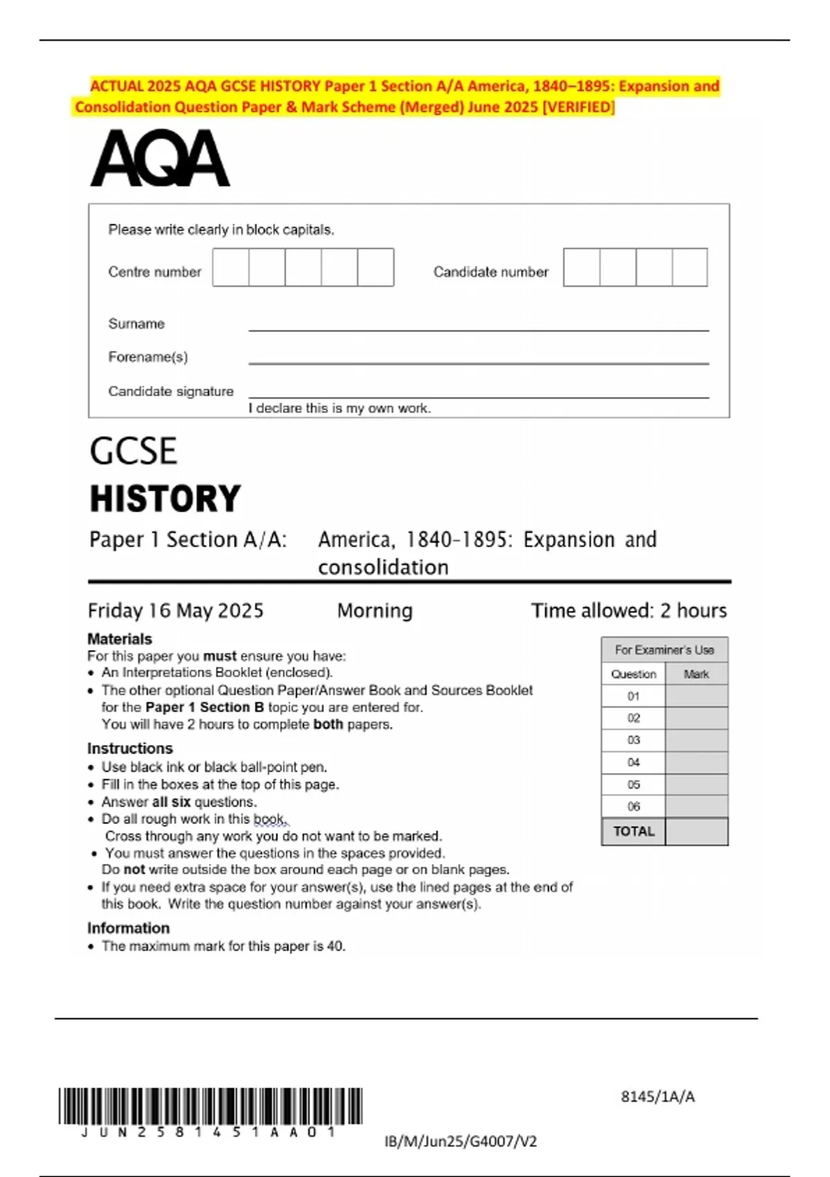 ACTUAL 2025 AQA GCSE HISTORY Paper 1 Section A/A America, 1840–1895: Expansion and