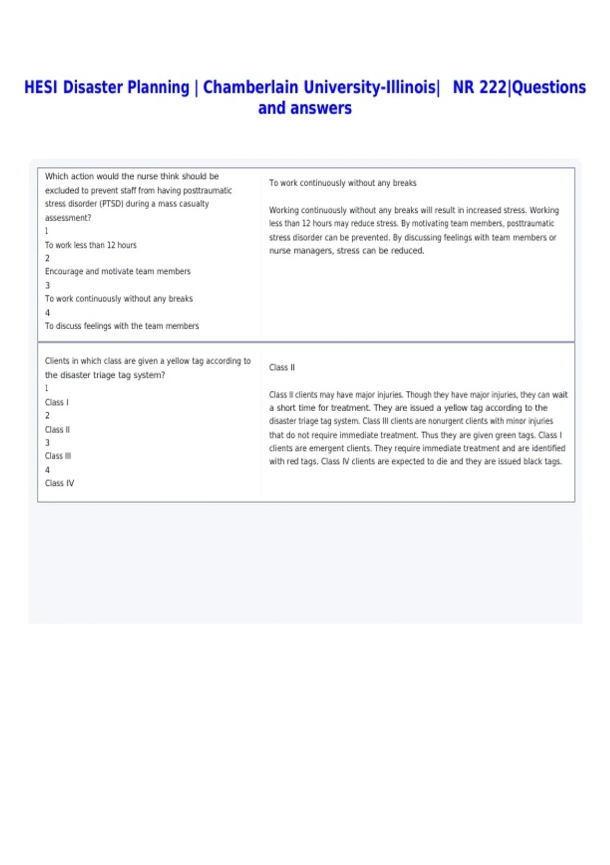 HESI Disaster Planning | Chamberlain University-Illinois| NR 222|Questions