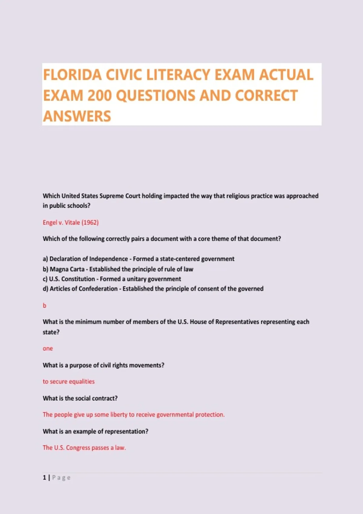 Florida Civic Literacy Exam 2024 – Actual 200 Questions & Verified Answers (Latest Test Bank)