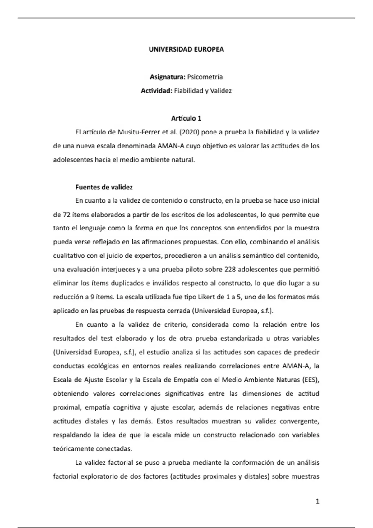 Actividad completa Fiabilidad y Validez de la asignatura Psicometría de la Universidad Europea. Obtuvo una calificación de sobresaliente