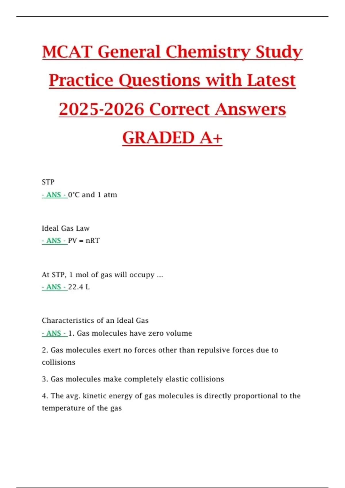 This document includes MCAT general chemistry practice questions with accurate and up-to-date answers for the 2025–2026 exam cycle. It covers key chemistry topics tested on the MCAT, helping students strengthen problem-solving skills, concept application, and exam readiness through focused practice.