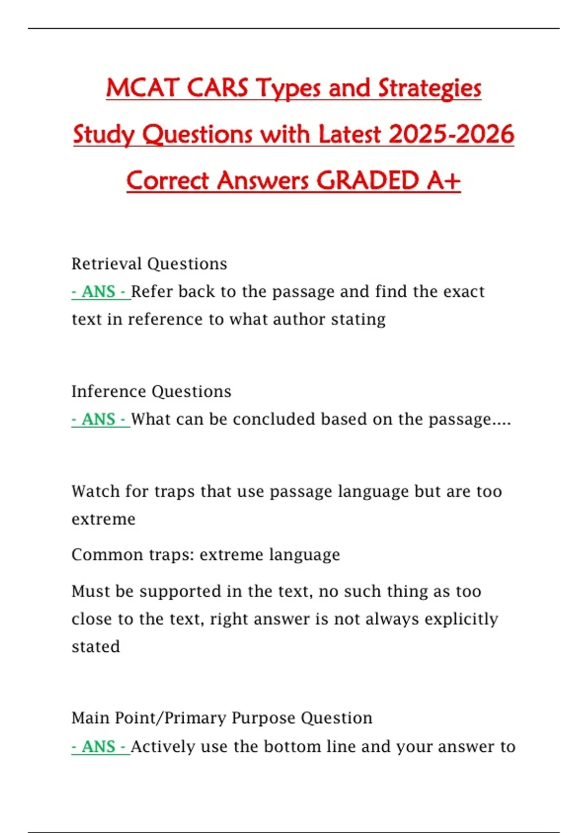 The MCAT CARS Types and Strategies Study Questions (2025/2026) resource provides a focused set of verified practice questions with correct answers designed to strengthen performance in the Critical Analysis and Reasoning Skills (CARS) section. This resource covers common CARS passage types, question formats, and proven test-taking strategies to improve comprehension, timing, and reasoning accuracy. Achieving a Grade A+, it serves as an effective study guide, strategy workbook, and self-assessment tool for mastering MCAT CARS and maximizing exam performance.