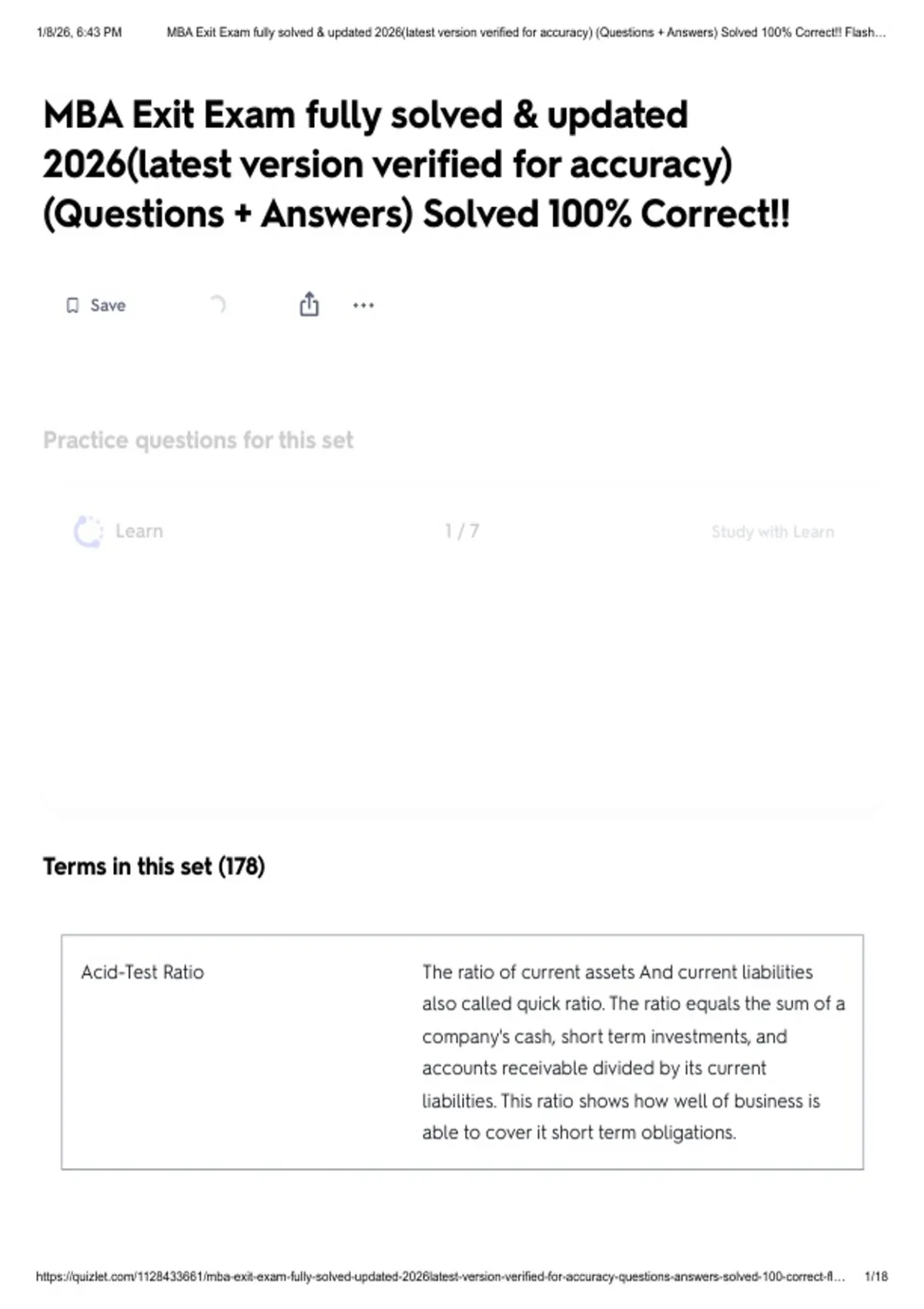, 1/8/26, 6:43 PM MBA Exit Exam fully solved & updated 2026(latest version verified for accuracy) (Questions + Answers) Solved 100% Correct!! Flash…
