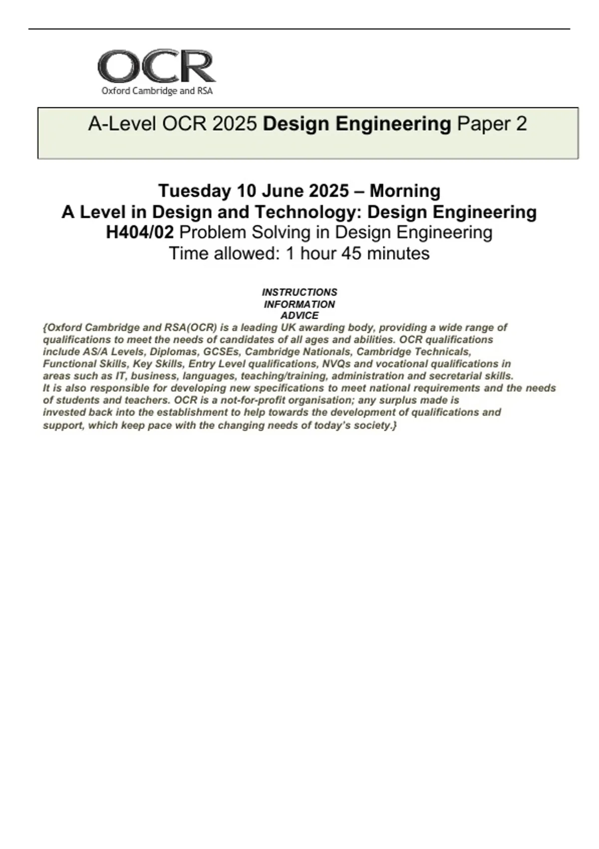 A-Level OCR 2025 Design Engineering Paper 2