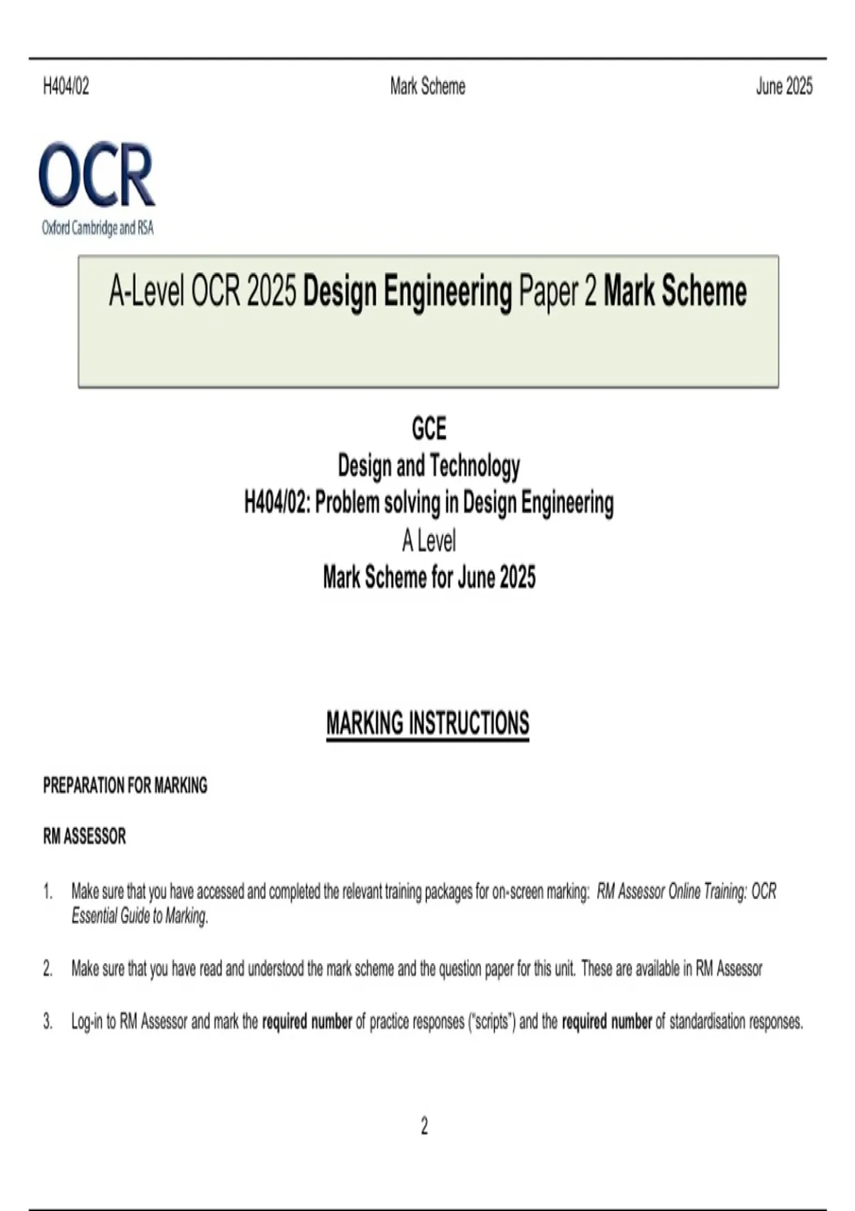 A-Level OCR 2025 Design Engineering Paper 2 Mark Scheme
