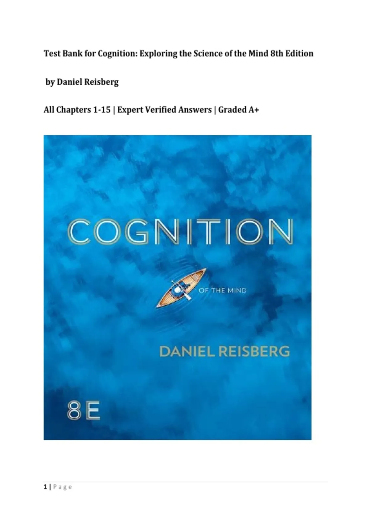 This test bank covers Cognition: Exploring the Science of the Mind 8th Edition by Daniel Reisberg, including all chapters from 1 to 15. It features comprehensive practice questions with expert-verified answers, designed to support exam preparation and mastery of core cognitive psychology concepts. The material is well-organized and suitable for psychology students aiming for top academic results.