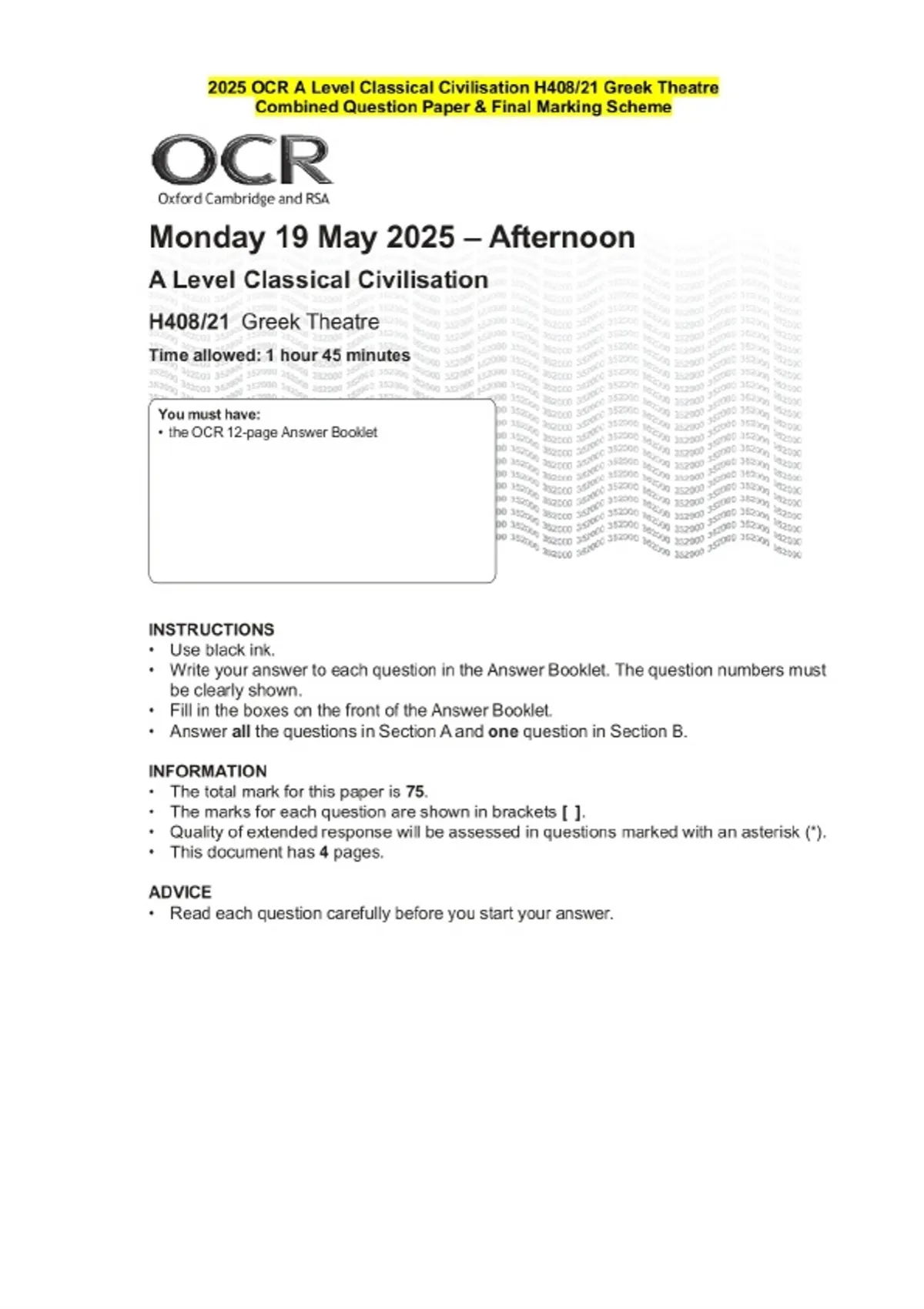 2025 OCR A Level Classical Civilisation H408/21 Greek Theatre Combined Exam paper along with marking scheme