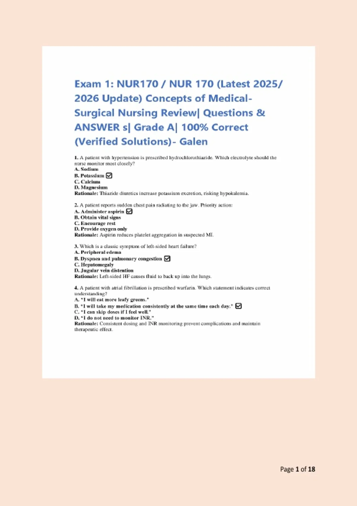 Ace your NUR170/NUR 170 Exam 1 with this complete, up-to-date test bank designed for the *2025/2026 academic year*! This resource is tailored for Galen College of Nursing students and anyone studying Medical-Surgical Nursing fundamentals. What’s Included: 100+ Practice Questions covering the most tested topics on Exam 1 Detailed Rationales for every answer to enhance understanding Updated Content aligned with the latest NUR170/NUR 170 course syllabus Priority Nursing Actions, Pharmacology, Fluid & Electrolytes, Acid-Base Balance, Pain Management, Pre/Post-Op Care, and More! Verified Grade A Solutions – perfect for self-study, review, and boosting exam confidence Key Topics Covered: Hypertension, Heart Failure, MI, Atrial Fibrillation Diuretic & Digoxin Therapy Pre-operative Assessment & Post-op Complications Fluid & Electrolyte Imbalances (Na, K, Ca, Mg) ABG Interpretation & Acid-Base Disorders Pain Assessment & Management (PCA, Opioids, Epidural) Wound Care, Transfusions, DVT Prevention Lab Values & Diagnostic Tests NCLEX-Style Prioritization & Delegation Why Buy This Test Bank? Saves Time – No need to compile questions; everything is in one place Boosts Scores – Understand why answers are correct with clear rationales Exam-Ready – Questions mimic the format and difficulty of the actual exam Digital Download – Instant access, study anytime on any device Trusted by Nursing Students – Designed to help you pass the first time Perfect For: Galen College NUR170/NUR 170 students Nursing students in any Med-Surg course NCLEX-RN prep focusing on medical-surgical content Instructors looking for ready-to-use practice questions Download now and take the stress out of Exam 1 prep!