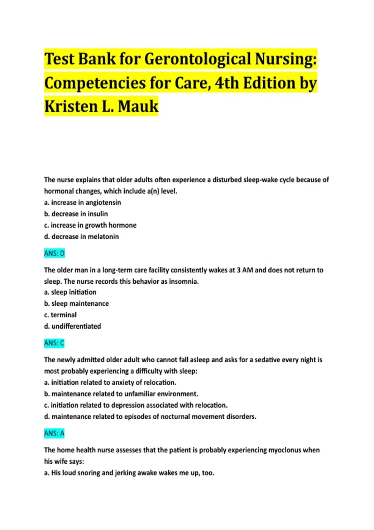 This is the complete official test bank for Gerontological Nursing: Competencies for Care, 4th Edition by Kristen L. Mauk. It contains all chapters with verified answers to multiple-choice, select-all-that-apply, and scenario-based questions—perfect for exam preparation, study review, and mastering gerontological nursing concepts. Features: 100% Accurate Answers – All questions include correct answers Covers All Chapters – Sleep disorders, pain management, elder abuse, nutrition, sensory changes, chronic conditions, and more Multiple Question Types – MCQs, SATA, case studies Ideal for Nursing Students – Helps with exams, quizzes, and NCLEX-style review Instant Digital Download – Ready to use after purchase This test bank is an essential study tool for nursing students, educators, and anyone preparing for certification or coursework in gerontological nursing.