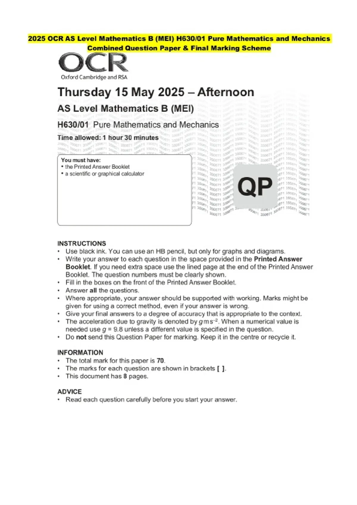 2025 OCR AS Level Mathematics B (MEI) H630/01 Pure Mathematics and Mechanics Combined Exam paper along with marking scheme
