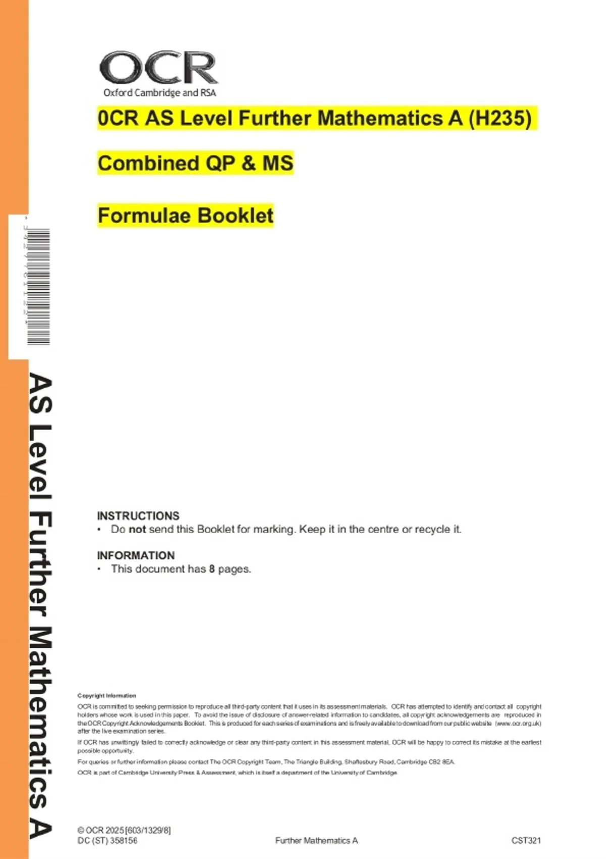 0CR AS Level Further Mathematics A (H235) Combined QP & MS Formulae Booklet