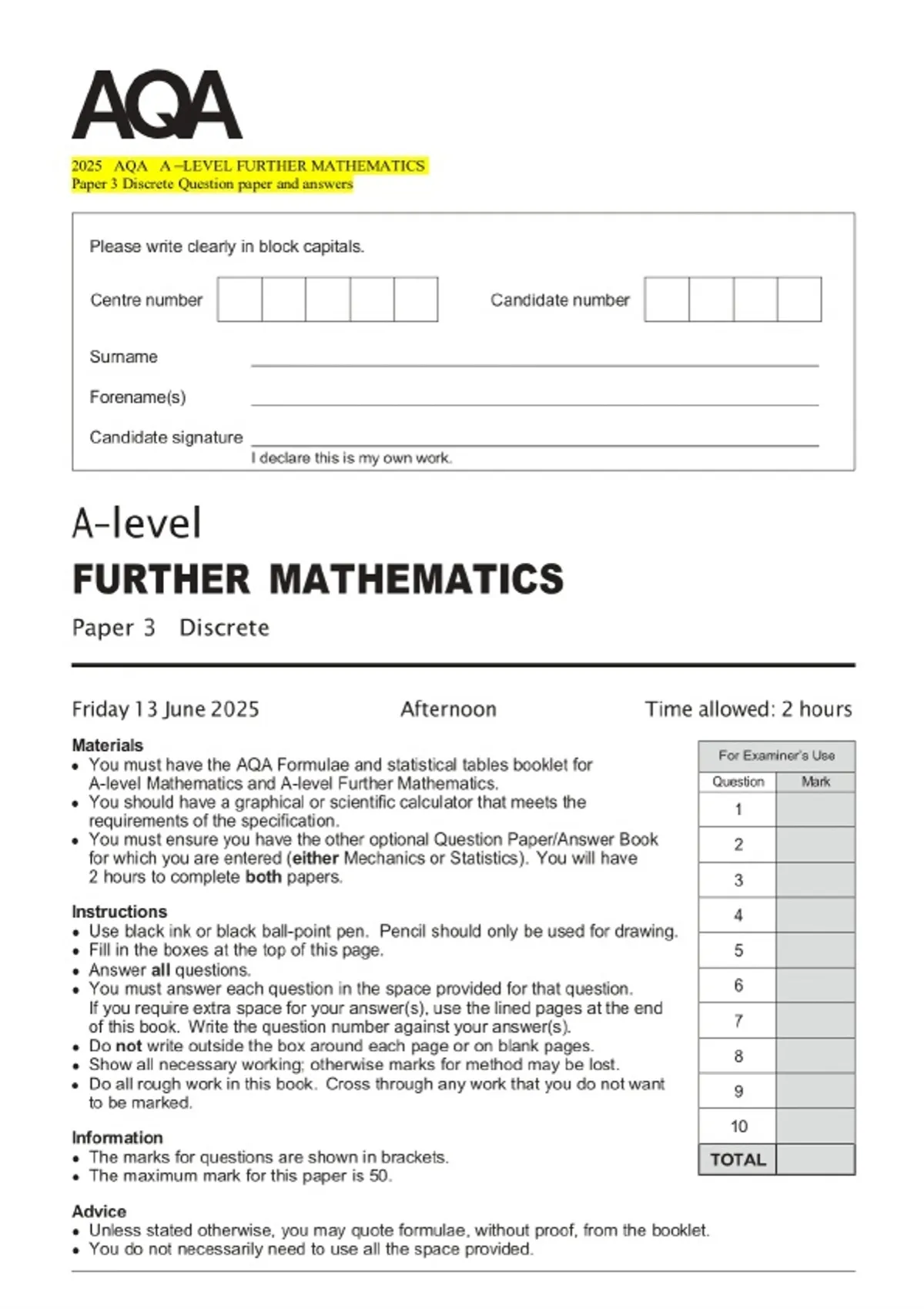 2025 AQA A –LEVEL FURTHER MATHEMATICS Paper 3 Discrete Exam paper along with marking scheme