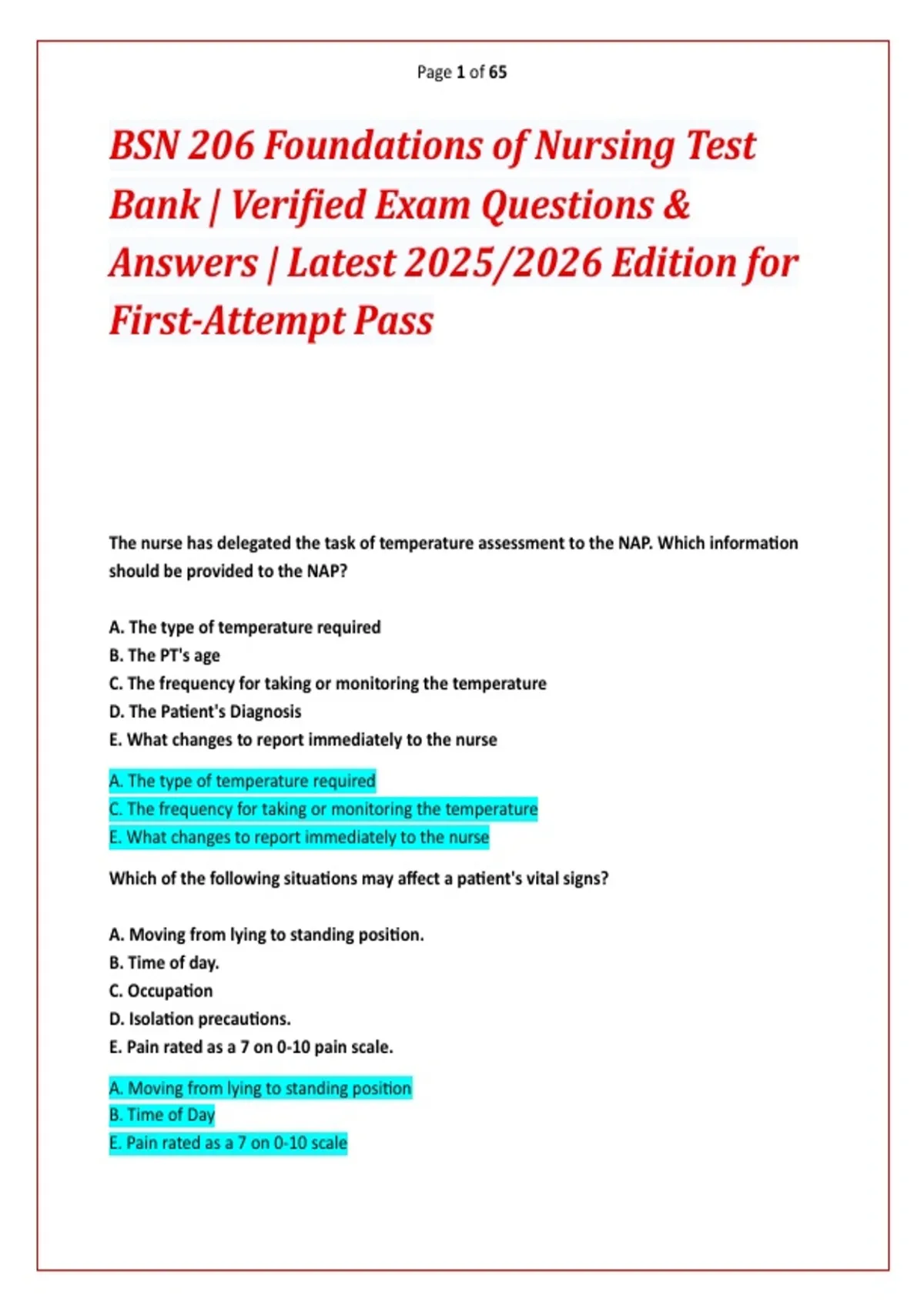 BSN 206 Foundations of Nursing Test Bank | 2025/2026 Edition | Exam Questions & Answers | Guaranteed First-Attempt Pass