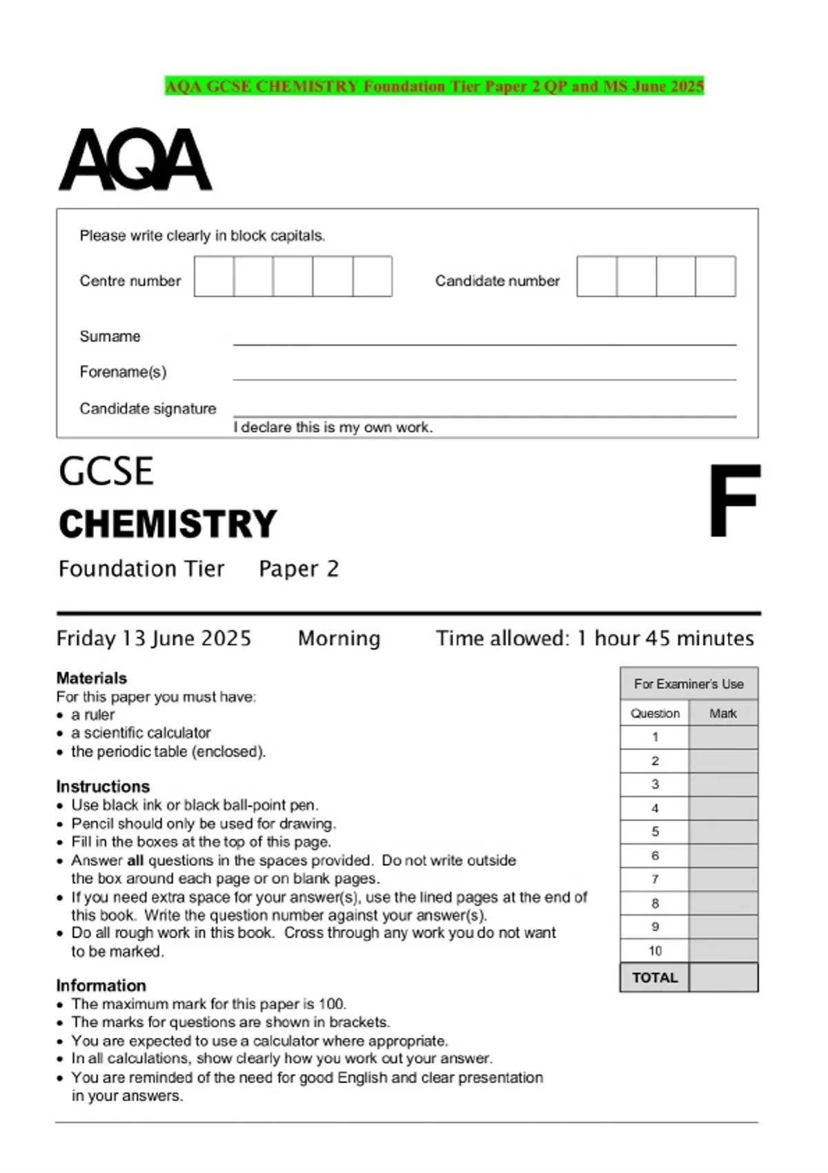 AQA GCSE CHEMISTRY Foundation Tier Paper 2 QP and MS June 2025