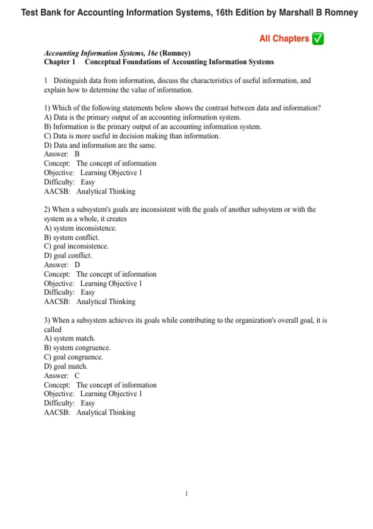 Test Bank for Accounting Information Systems, 16th Edition by Marshall B Romney