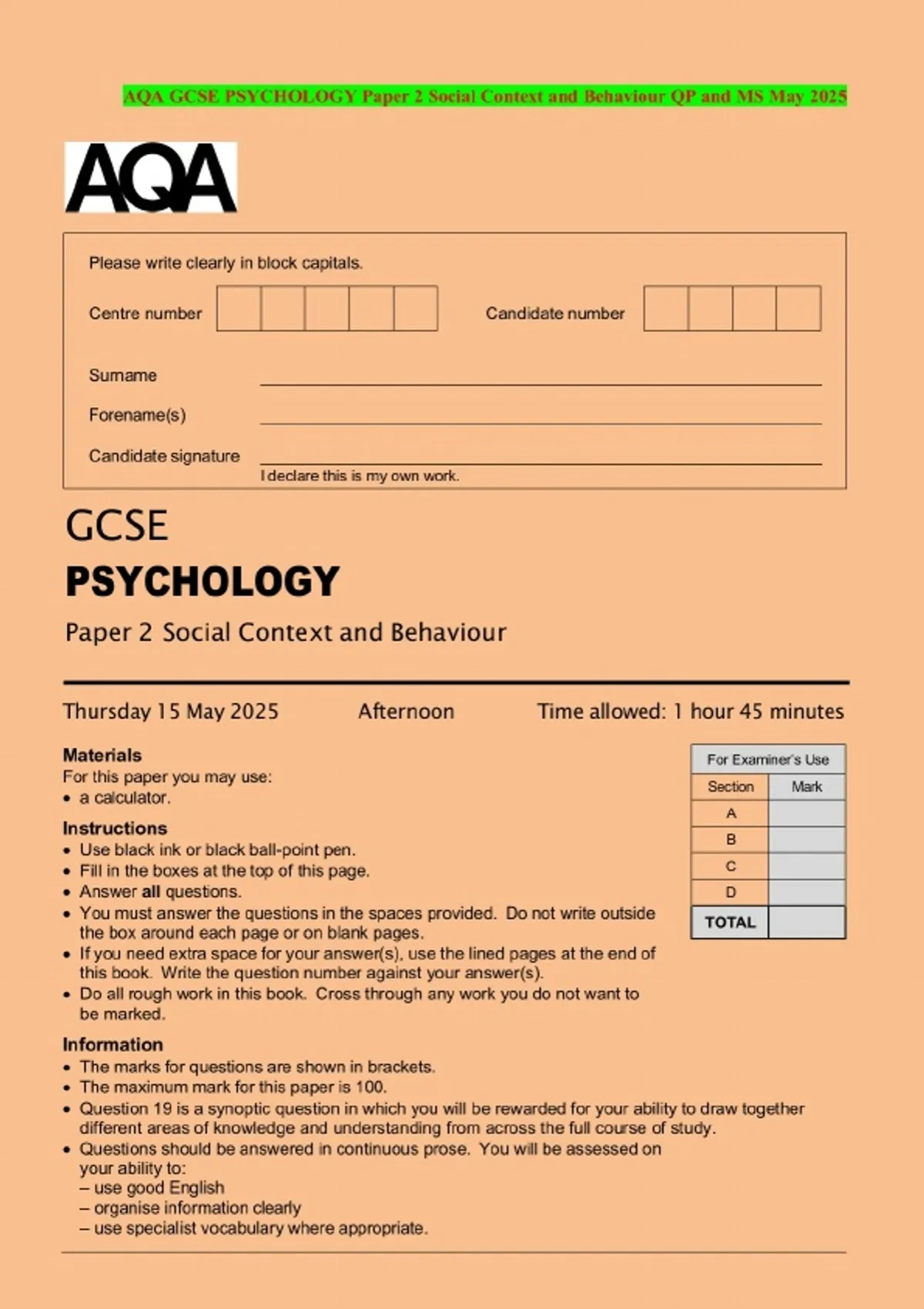 AQA GCSE PSYCHOLOGY Paper 2 Social Context and Behaviour QP and MS May 2025