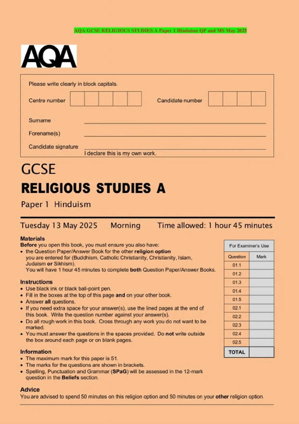 AQA GCSE RELIGIOUS STUDIES A Paper 1 Hinduism QP and MS May 2025
