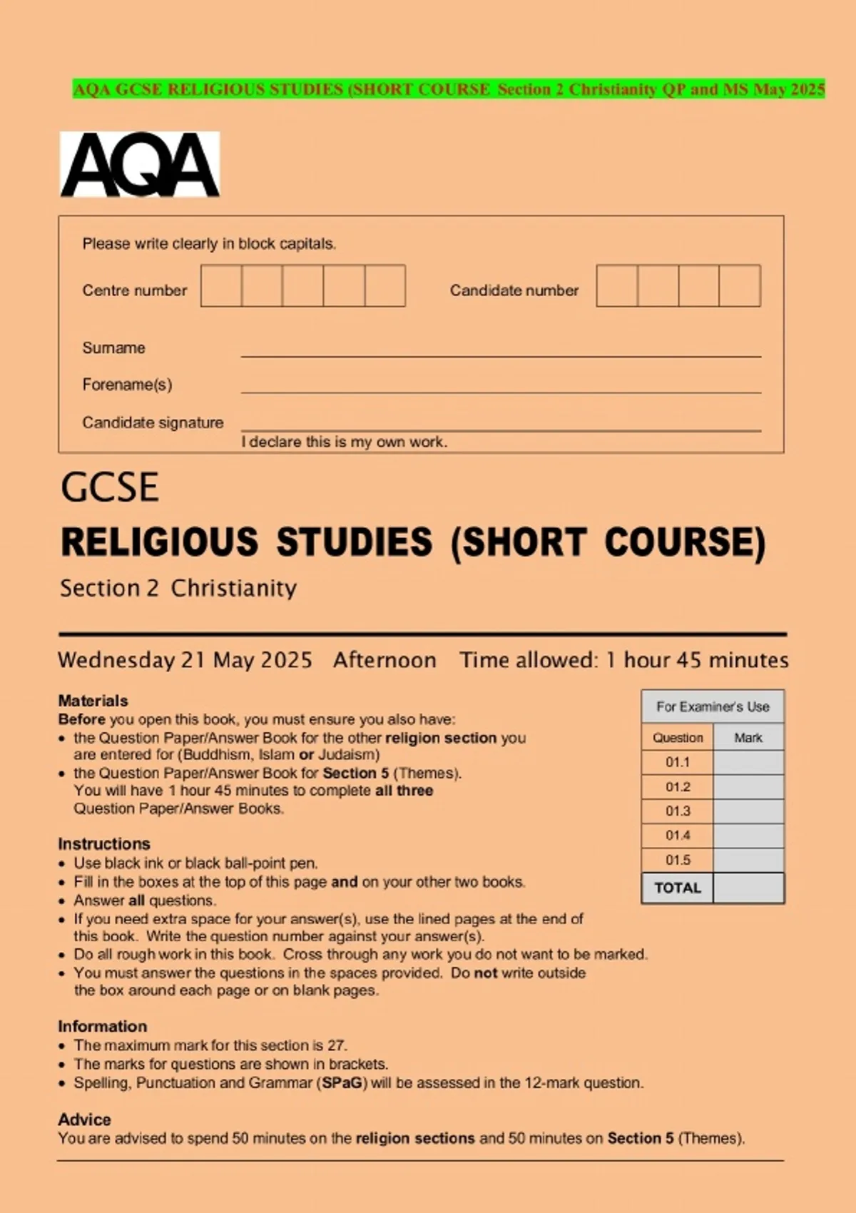 AQA GCSE RELIGIOUS STUDIES (SHORT COURSE Section 2 Christianity QP and MS May 2025