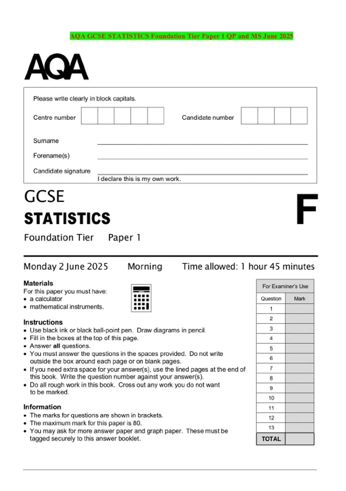 AQA GCSE STATISTICS Foundation Tier Paper 1 QP and MS June 2025