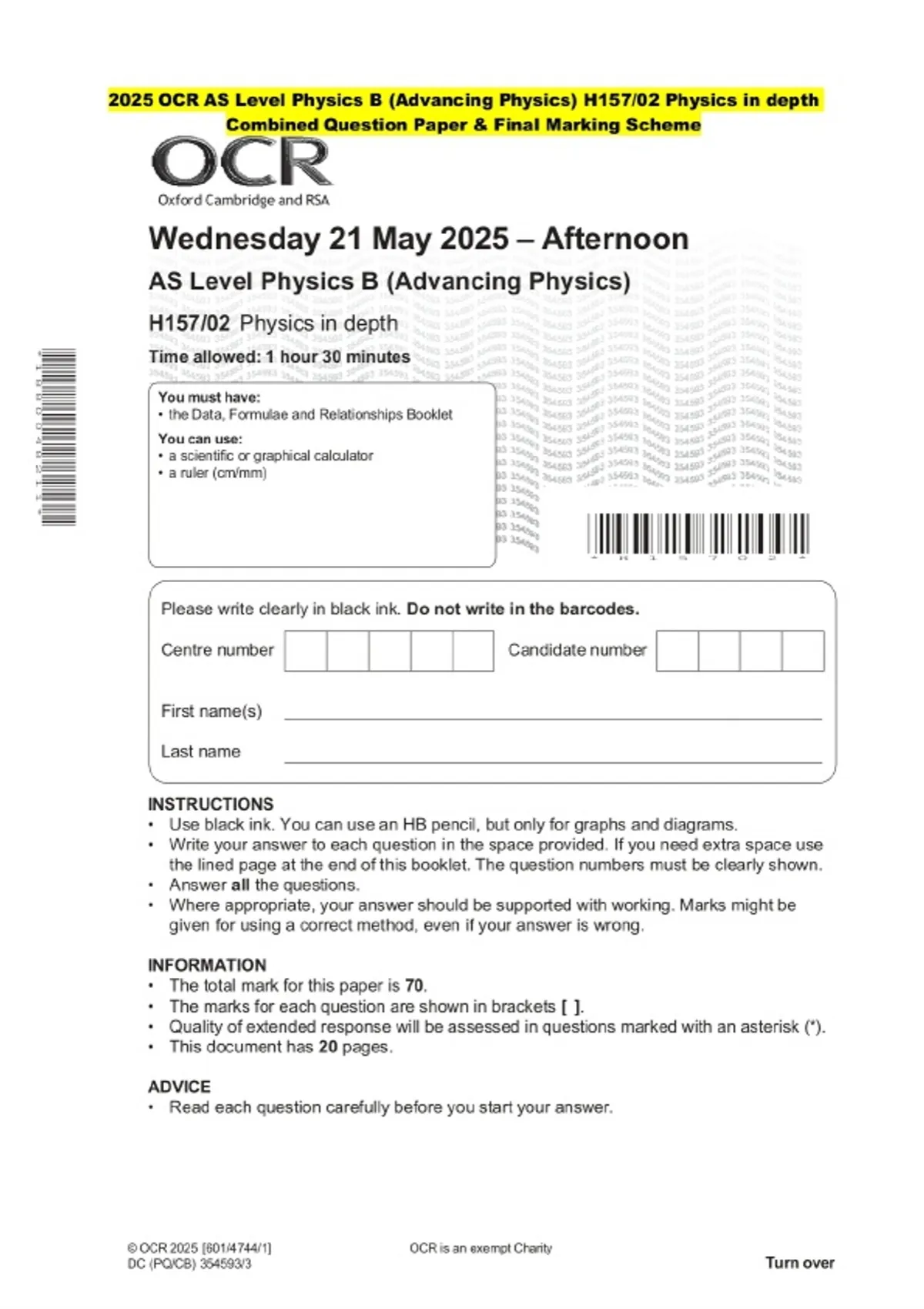 2025 OCR AS Level Physics B (Advancing Physics) H157/02 Physics in depth Question Paper and Final Evaluation Scheme