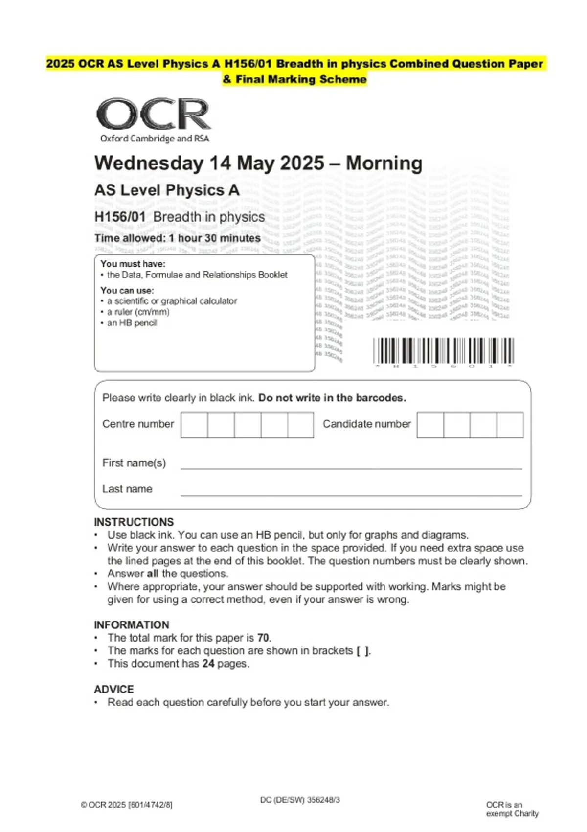 2025 OCR AS Level Physics A H156/01 Breadth in physics Question Paper and Final Evaluation Scheme