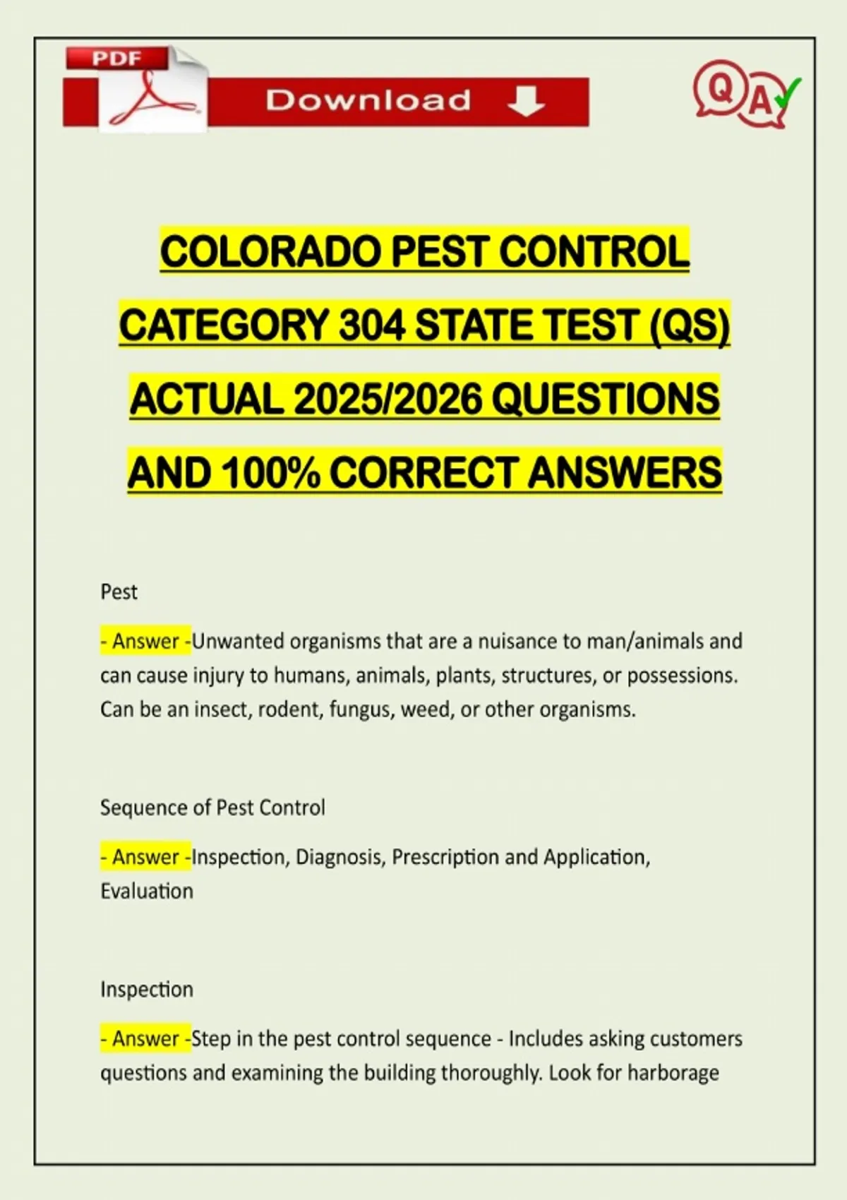 COLORADO PEST CONTROL CATEGORY 304 STATE TEST (QS) ACTUAL 2025/2026 QUESTIONS AND 100% CORRECT ANSWERS Pest - Answer -Unwanted organisms that are a nuisance to man/animals and can cause injury to humans, animals, plants, structures, or possessions. Can be an insect, rodent, fungus, weed, or other organisms. Sequence of Pest Control - Answer -Inspection, Diagnosis, Prescription and Application, Evaluation Inspection - Answer -Step in the pest control sequence - Includes asking customers questions and examining the building thoroughly. Look for harborageNeed assistance on Online classes, Exams & Assignments? Reach out for instant help!! Full Course Assistance, Plagiarism-free Essay Writing, Research Paper, Dissertation, Discussion Posts, etc…. Confidential & Secure services. Tutors are available for all subjects! Email now at: areas, conducive conditions (moisture, heat, etc), food/water sources, means of entry, and evidence of infestations (damage, droppings, etc) Diagnosis - Answer -Step in the pest control sequence - Includes identification of the pest and any facts contributing to infestation. Prescription and Application - Answer -Step in the pest control sequence - what, how, when, an