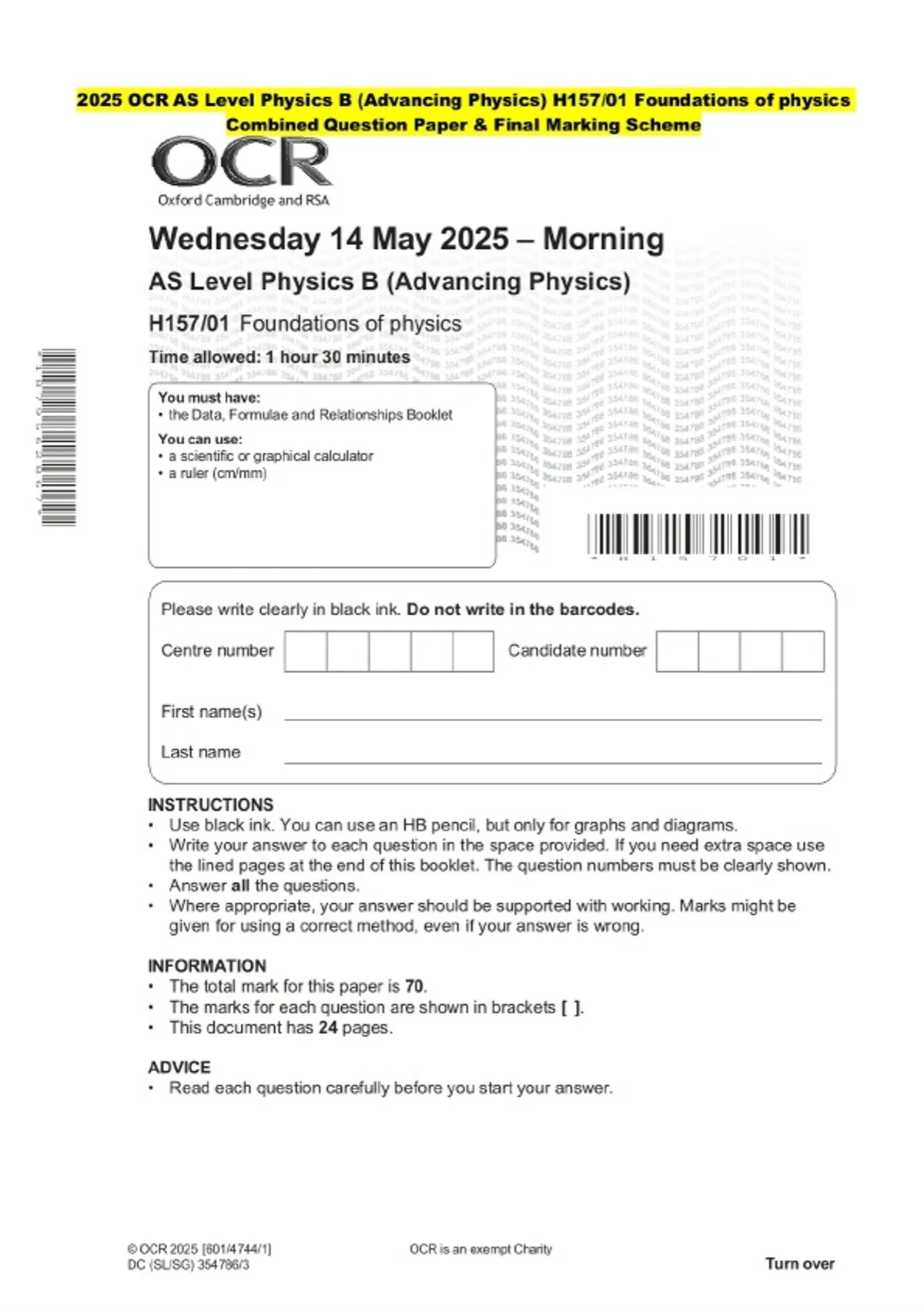 2025 OCR AS Level Physics B (Advancing Physics) H157/01 Foundations of physics Question Paper and Final Evaluation Scheme