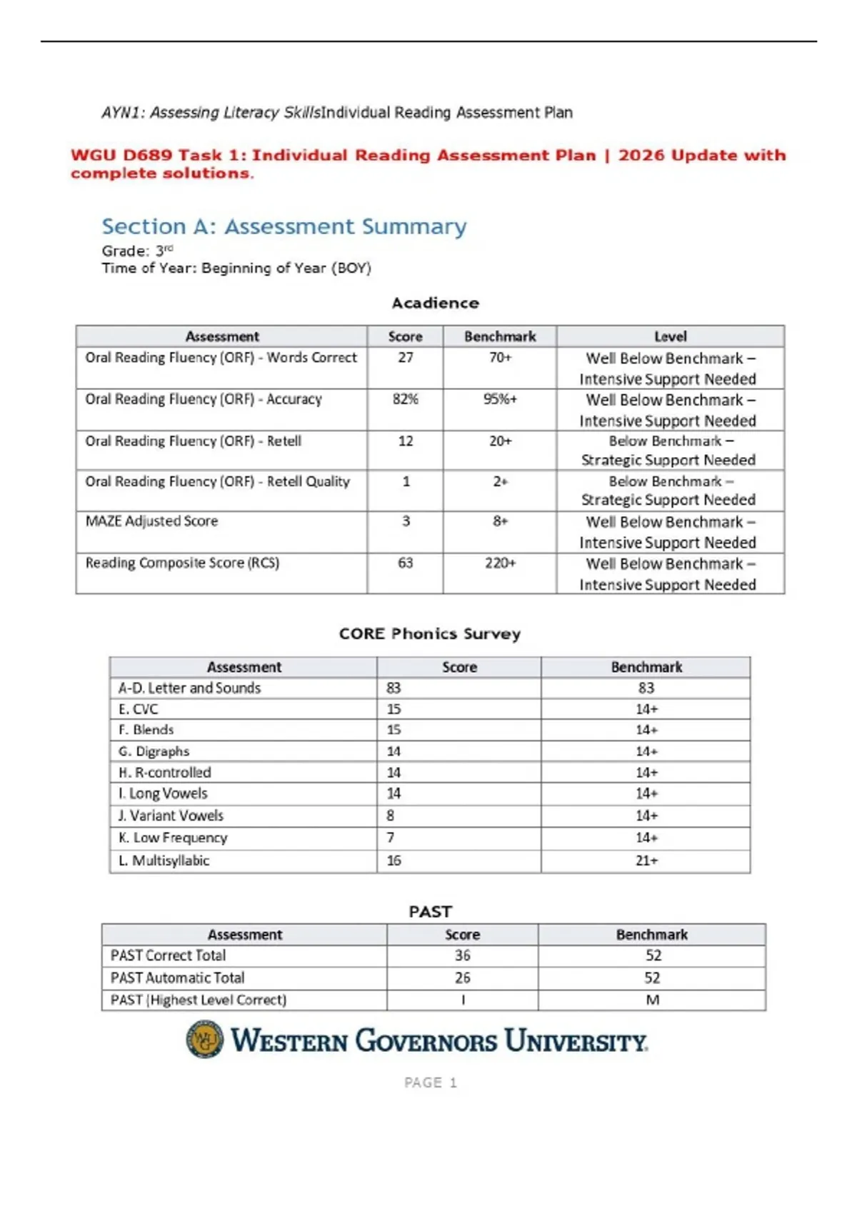 WGU D689 Task 1: Individual Reading Assessment Plan | 2026 Update with complete solutions.