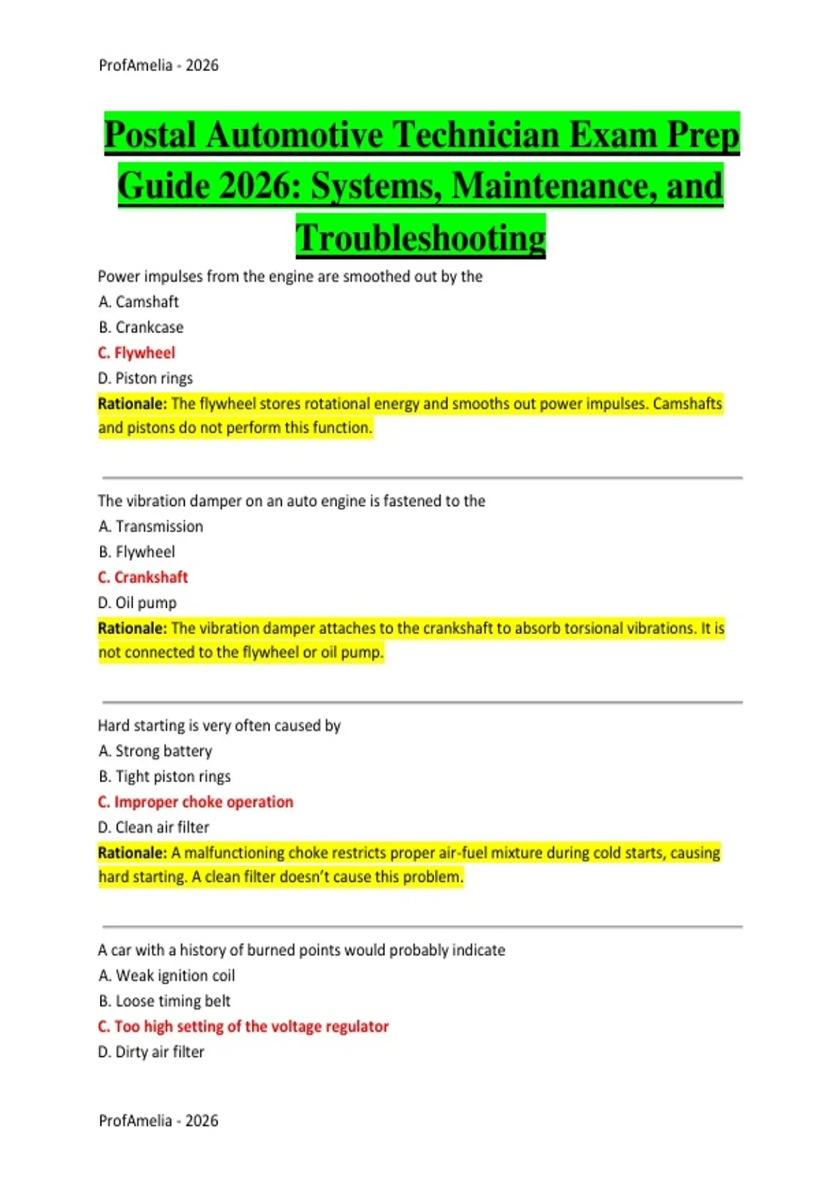 Power impulses from the engine are smoothed out by the A. Camshaft B. Crankcase C. Flywheel D. Piston rings Rationale: The flywheel stores rotational energy and smooths out power impulses. Camshafts and pistons do not perform this function. The vibration damper on an auto engine is fastened to the A. Transmission B. Flywheel C. Crankshaft D. Oil pump Rationale: The vibration damper attaches to the crankshaft to absorb torsional vibrations. It is not connected to the flywheel or oil pump. Hard starting is very often caused by A. Strong battery B. Tight piston rings C. Improper choke operation D. Clean air filter Rationale: A malfunctioning choke restricts proper air-fuel mixture during cold starts, causing hard starting. A clean filter doesn’t cause this problem. A car with a history of burned points would probably indicate A. Weak ignition coil B. Loose timing belt C. Too high setting of the voltage regulator D. Dirty air filter Rationale: Excessive voltage overheats and burns ignition points. This is usually due to an overcharging voltage regulator. When reconditioning brake drums, the maximum allowable oversize is A. .020 inches B. .040 inches C. .060 inches D. .100 inches Rationale: Exceeding .060 inches oversize weakens the drum and impairs braking. Smaller sizes are within safe limits. The amount of air-fuel mixture taken into the cylinder on the intake stroke is a measure of the engine’s A. Brake horsepower B. Torque ratio C. Volumetric efficiency D. Compression ratio Rationale: Volumetric efficiency indicates how effectively the cylinder fills with the air-fuel mixture during the intake stroke. Welch plugs are installed on engines to provide A. Extra cooling B. Extra compression C. A means of removing the sand after casting D. Better lubrication Rationale: Welch (freeze) plugs allow removal of sand used in casting the engine block. They’re not for cooling or compression directly. The two-cycle engine produces a power stroke with every A. Two strokes of the piston B. Two revolutions of the crankshaft C. One revolution of the crankshaft D. Four strokes of the piston Rationale: In a two-stroke engine, every crankshaft revolution produces one power stroke, unlike four-stroke engines. Preignition may be caused by A. Low compression B. Lean mixture C. Carbon deposits D. Cold spark plug Rationale: Carbon deposits retain heat and ignite the mixture early (preignition). Lean mixtures more often cause detonation, not preignition. The size of an outboard motor propeller is given in A. Horsepower and thrust B. Length and width C. Diameter and pitch D. Radius and torque Rationale: Propeller size is defined by diameter and pitch, which determine water displacement and engine load. Closed crankcase ventilation systems are used to A. Increase fuel economy B. Cool the engine faster C. Aid in prevention of air contamination D. Warm the intake manifold Rationale: These systems recycle crankcase vapors back to the intake to reduce pollution. They don't significantly affect cooling or fuel economy. The angular motion about the vertical axis of an aircraft is known as A. Pitch B. Roll C. Yaw D. Drift Rationale: Yaw is rotation around the vertical axis. Pitch is around the lateral axis, and roll around the longitudinal axis. The carburetor circuit that maintains a constant fuel level in the float bowl is the A. Idle circuit B. Main circuit C. Float circuit D. Power circuit Rationale: The float circuit controls the needle valve to maintain fuel level. Other circuits manage mixture delivery during specific engine loads. A jet engine combustion chamber liner is cooled by A. Liquid fuel B. Oil circulation C. Air streams D. Coolant fluid Rationale: Air is directed around the liner to cool it and prevent overheating. Jet engines don’t use liquid coolant systems. Regenerative gas turbine engines have been successfully developed for use on A. Motorcycles B. Boats C. Automobiles D. Helicopters Rationale: Regenerative turbines reuse exhaust heat to improve efficiency and have been tested in automobiles more than other options. In a generator system, excessive output voltage is usually controlled by the A. Field windings B. Voltage regulator C. Armature resistance D. Battery cables Rationale: The voltage regulator maintains proper system voltage. Field windings and armatures cannot regulate voltage on their own. The main purpose of piston rings is to A. Cool the cylinder walls B. Seal the combustion chamber C. Lubricate the crankshaft D. Increase fuel pressure Rationale: Piston rings prevent gas leakage and maintain compression. They don’t control fuel pressure or crankshaft lubrication. Detonation in an engine is caused primarily by A. Cold spark plugs B. Low engine temperature C. High combustion temperatures and pressures D. Thick engine oil Rationale: Detonation occurs when fuel-air mixture explodes violently due to high temperature and pressure. Oil and spark plug temperature are unrelated. The primary purpose of a thermostat in an engine cooling system is to A. Increase coolant pressure B. Prevent coolant leaks C. Regulate engine temperature D. Speed up fuel combustion Rationale: The thermostat maintains optimal engine operating temperature by opening and closing to control coolant flow. An alternator produces electricity when its A. Field windings stay stationary B. Rotor spins inside the stator C. Battery is discharged D. Voltage regulator is bypassed Rationale: Alternators generate electricity by rotating a magnetic rotor inside a stationary stator to induce current. A clogged air filter will cause the engine to run A. Lean B. Rich C. At higher RPM D. With higher oil pressure Rationale: A clogged air filter reduces airflow, causing a rich air-fuel mixture. It doesn’t increase oil pressure or RPM. The purpose of a muffler in the exhaust system is to A. Increase horsepower B. Reduce engine noise C. Cool exhaust gases D. Improve fuel economy Rationale: Mufflers reduce sound from exhaust gases. The
