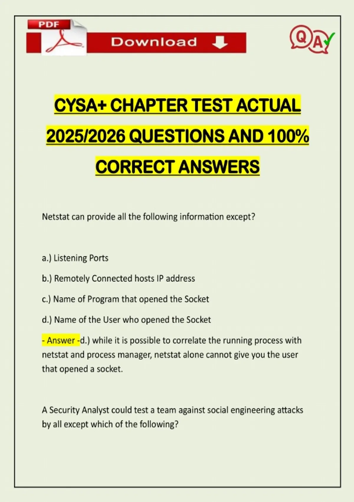 CYSA+ CHAPTER TEST ACTUAL 2025/2026 QUESTIONS AND 100% CORRECT ANSWERS Netstat can provide all the following information except? a.) Listening Ports b.) Remotely Connected hosts IP address c.) Name of Program that opened the Socket d.) Name of the User who opened the Socket - Answer -d.) while it is possible to correlate the running process with netstat and process manager, netstat alone cannot give you the user that opened a socket. A Security Analyst could test a team against social engineering attacks by all except which of the following?Need assistance on Online classes, Exams & Assignments? Reach out for instant help!! Full Course Assistance, Plagiarism-free Essay Writing, Research Paper, Dissertation, Discussion Posts, etc…. Confidential & Secure services. Tutors are available for all subjects! Email now at: a.) Pretexting b.) Spear-Fishing c.) Footprinting d.) tailgating - Answer -c.) Footing printing is a technical operation gathering data on a logical device.