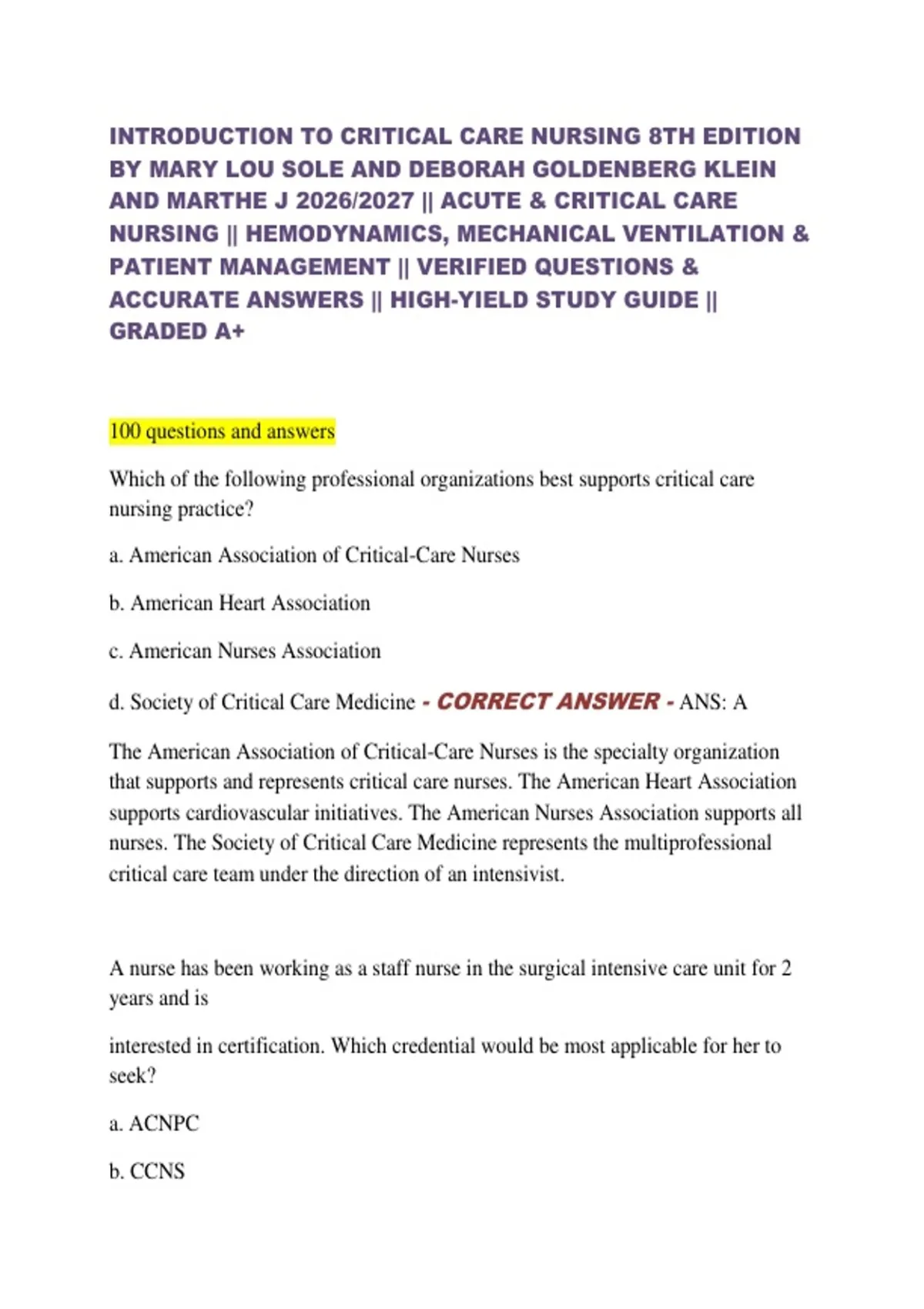 INTRODUCTION TO CRITICAL CARE NURSING 8TH EDITION BY MARY LOU SOLE AND DEBORAH GOLDENBERG KLEIN AND MARTHE J 2026/2027 || ACUTE & CRITICAL CARE NURSING || HEMODYNAMICS, MECHANICAL VENTILATION & PATIENT MANAGEMENT || VERIFIED QUESTIONS & ACCURATE ANSWERS || HIGH-YIELD STUDY GUIDE || GRADED A+ 100 questions and answers Which of the following professional organizations best supports critical care nursing practice? a. American Association of Critical-Care Nurses b. American Heart Association c. American Nurses Association d. Society of Critical Care Medicine - CORRECT ANSWER - ANS: A