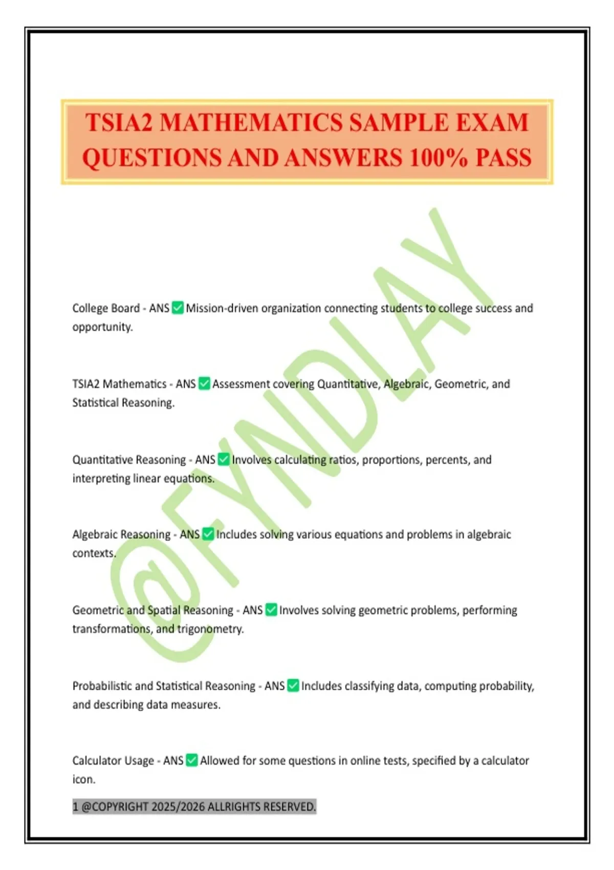 TSIA2 Mathematics - ANS Assessment covering Quantitative, Algebraic, Geometric, and